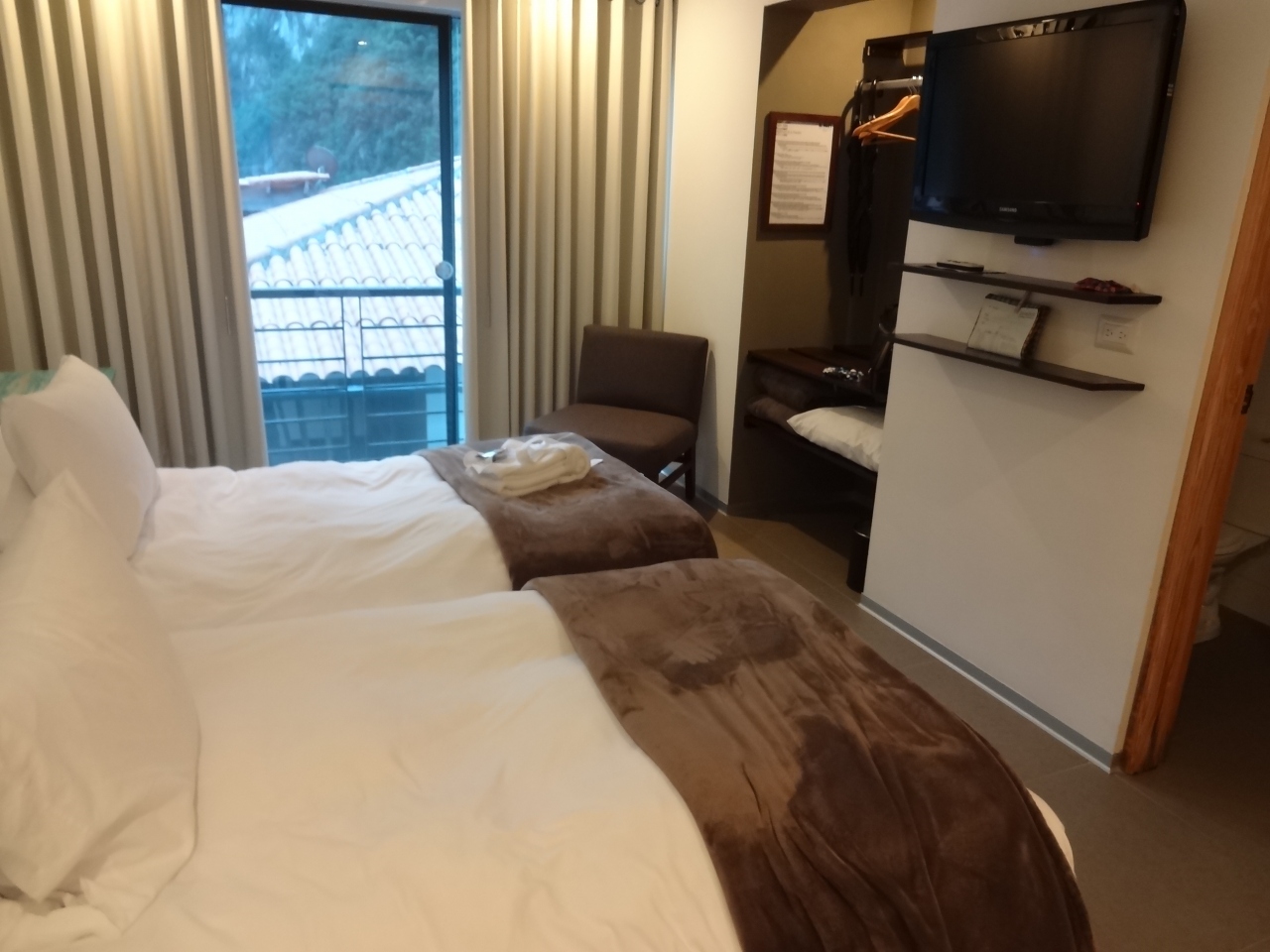 ホテルはマチュピチュの土産物のお店の集まりを抜けた先にあり、坂道の勾配に沿ってフロント、バー、レストランと宿泊スペースが別棟で並んだつくりになっています。エレベーターはないのでフロントから宿泊棟まで移動が大変です。 ウェルカムドリンクとして、バーでピスコサワーが1杯無料になる券をもらえます。部屋はきれいですが、時間が悪かったのか、シャワーのお湯がでませんでした。無料wi-fiがあります。