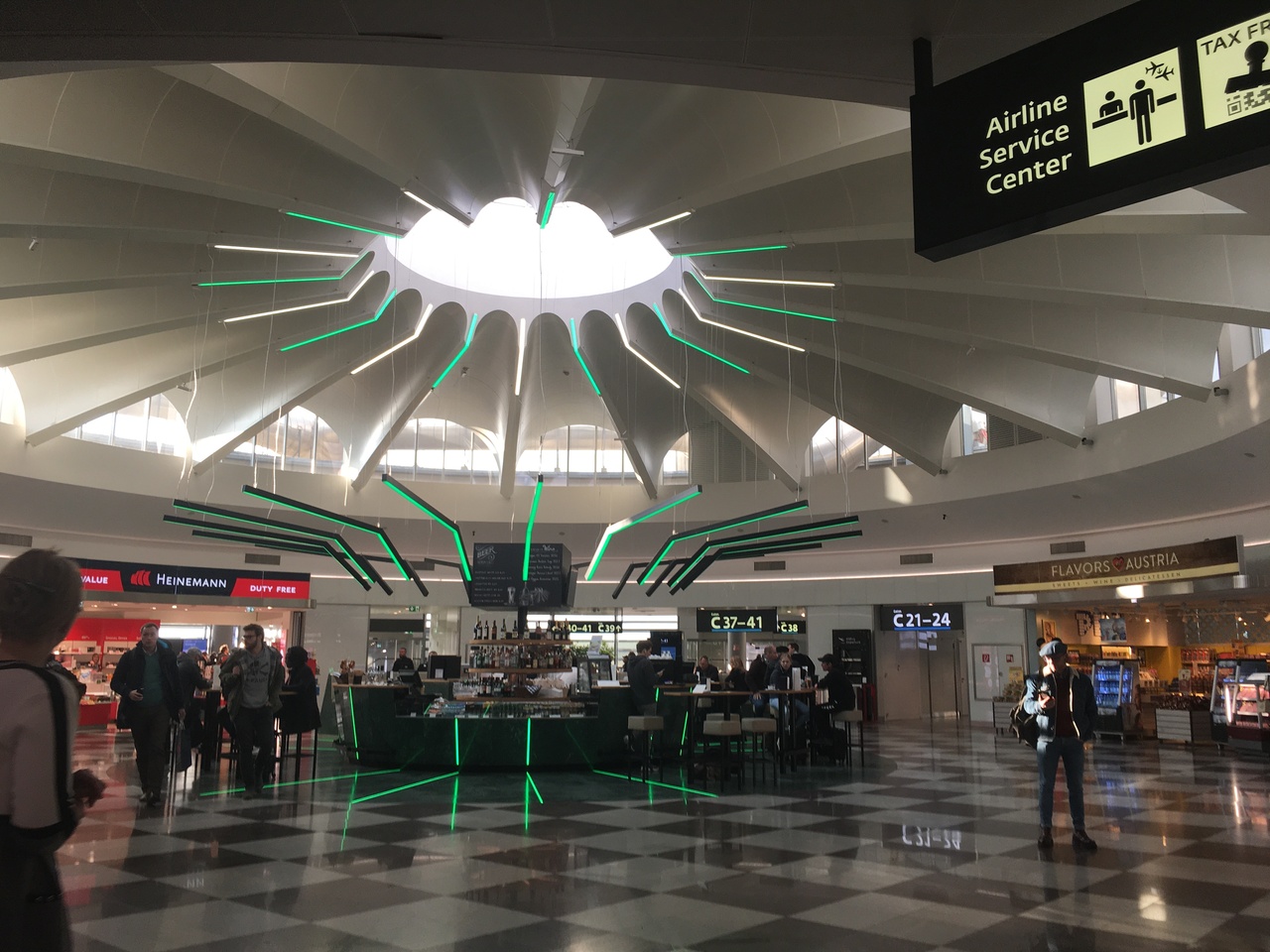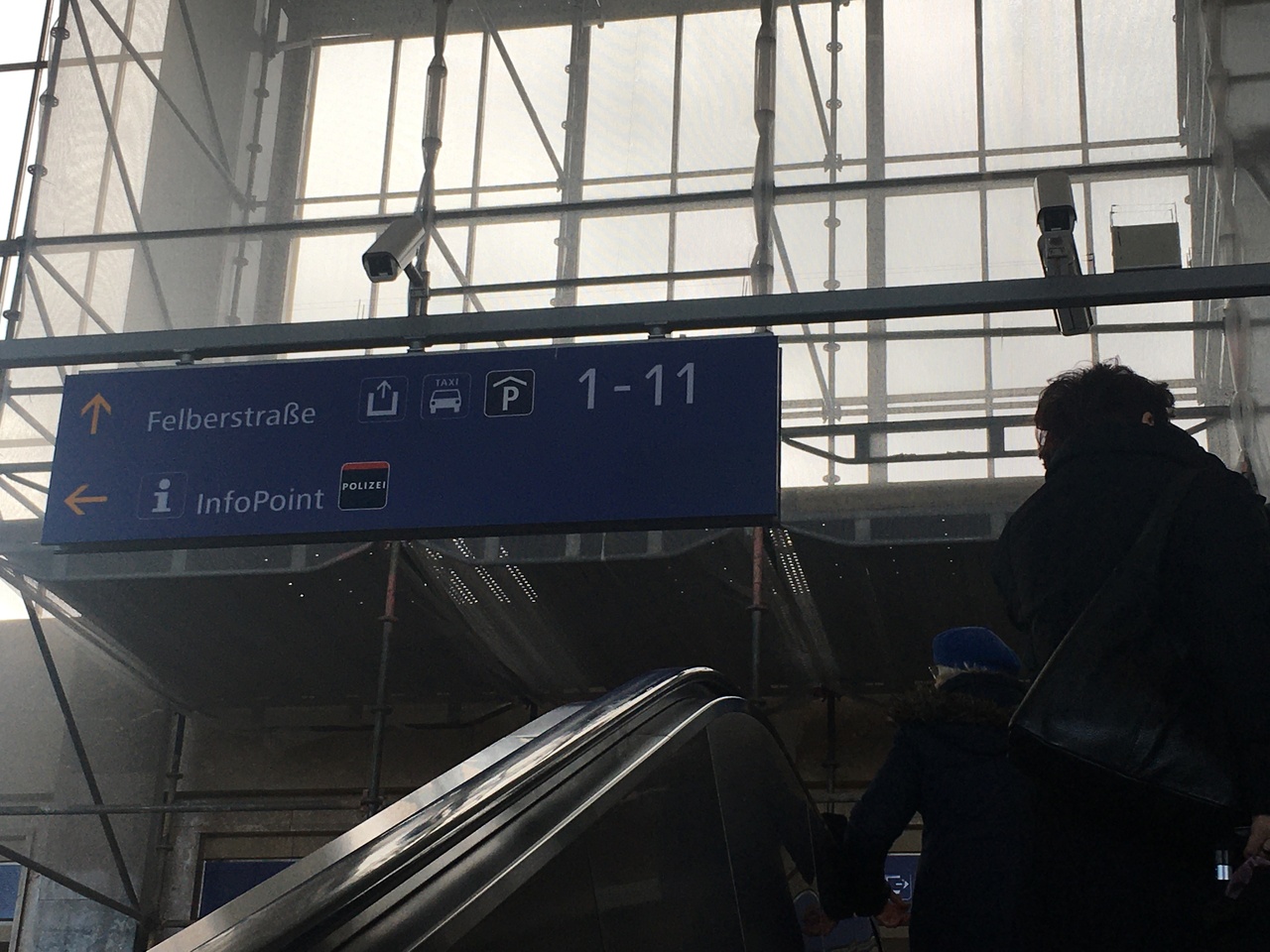 電光掲示板を見ると、ドイツ各都市からの便が多かったです。私はドイツのシュトゥットガルトからの便で到着後、表示に沿って電車に乗るため駅に向かいました。搭乗口付近に充電できる電源(USBとコンセント)がありました。