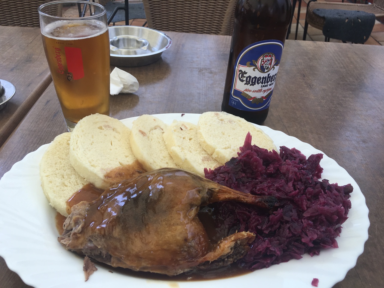 チェスキークルムロフ城観光後、エッゲンベルグビール醸造所のレストランが満席で、旧市街を散策しながら空席を見つけたのでここにしました。中庭テラス席でしたが、雨が降っていたので寒かったです。エッゲンベルグビールと鴨のローストを注文。他の客もみんな現金払いだったので、カードは使えないようでした。
