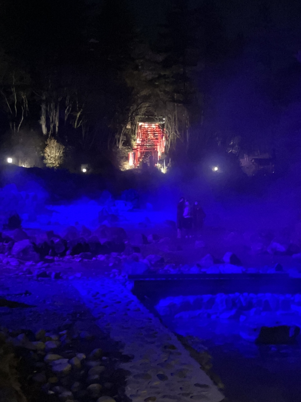 12月は、クリスマスツリーも点灯していました。西の河原近くの宿から歩いて行ったのですが、日が落ちた夕方ですでに道中のお店が閉まっていて、少し怖かったです。湯畑付近は人通りがあります。紫系の色で綺麗にライトアップされています。