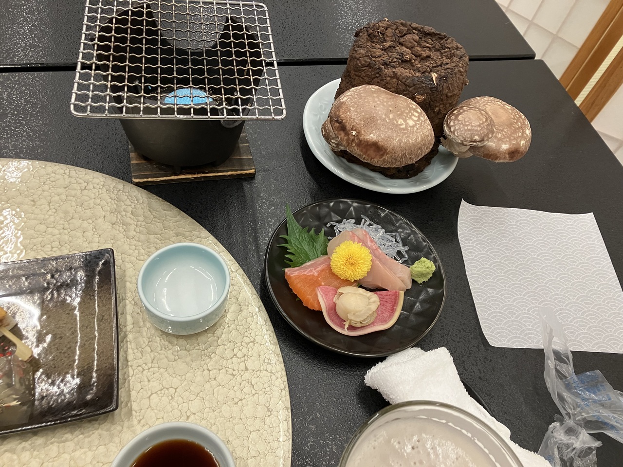 地獄谷野猿公苑を観光した後チェックイン。地獄谷野猿公苑近くへの送迎サービスがありましたが、チェックイン前に行ってしまってのでキャンセルしました。夜食の食前酒のりんごワインが甘くてとても美味しかったので、銘柄を聞いて土産に買えばよかったと後悔しました。原木椎茸を手もぎして網焼きするのがユニークでした。