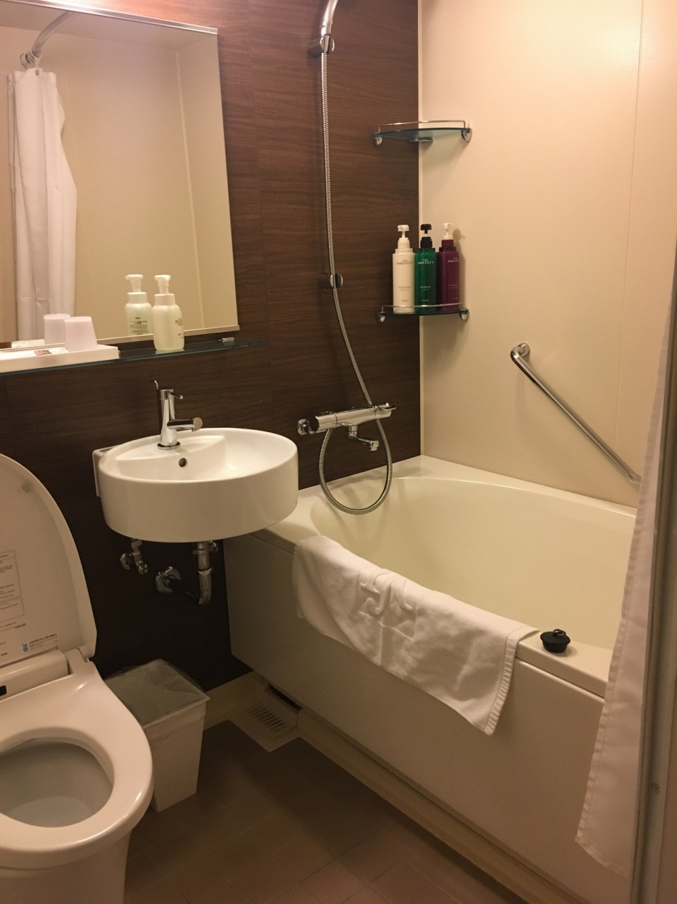 直結というか、入口はもはや構内かのような場所でした。雨でも濡れずにいけます。部屋から改札やバス停にも5分以内くらいで到着できるので便利です。部屋は普通のビジネスホテルですが、バスタブはありました。窓からは駅のホームと観覧車が見れます。素泊まりだったので朝食はわかりません。