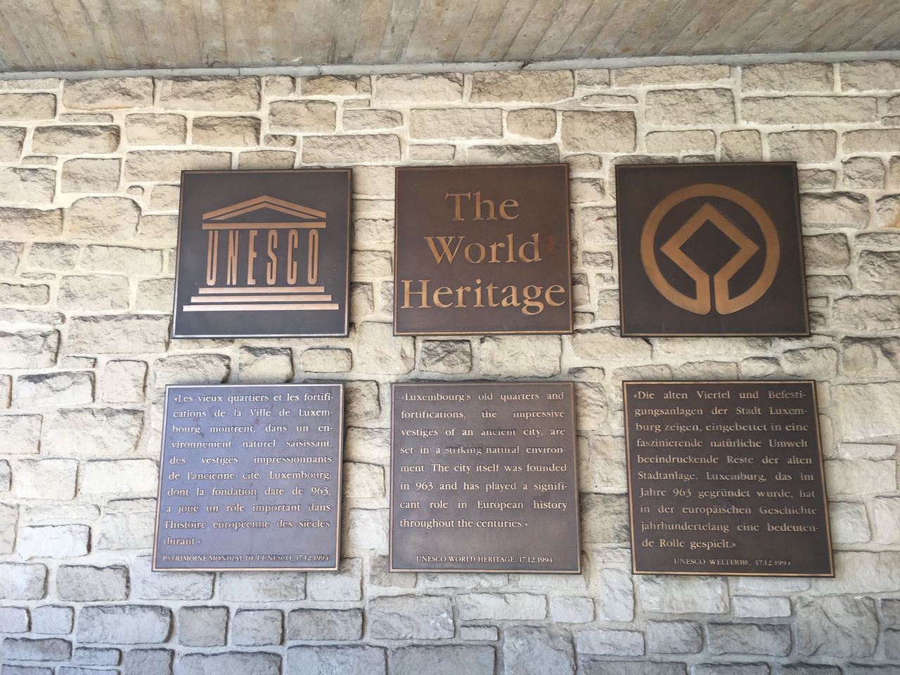 ルクセンブルク中央駅から徒歩15分くらいで、美しい旧市街が見えてきました。私はアドルフ橋、憲法広場、ノートルダム大聖堂、ギヨーム広場、大公宮、国立博物館、ボックの砲台を歩いて回りましたが、2時間前後で見終わりました。世界遺産のプレートはボックの砲台で見かけました。