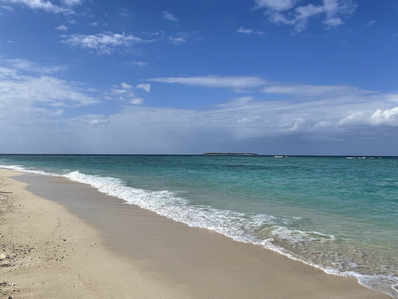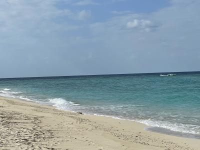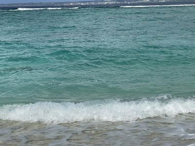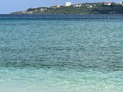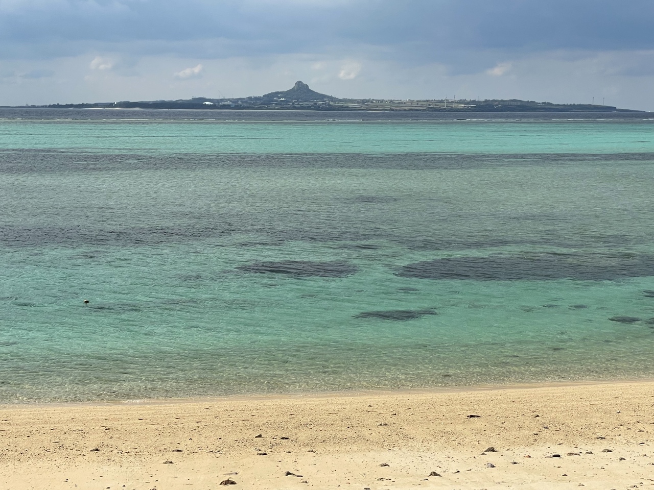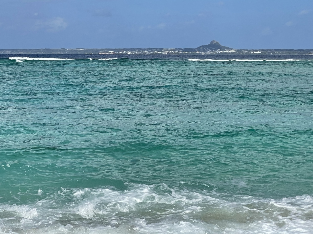 瀬底島のヒルトンホテル瀬底の前に広がるビーチです。軽石が撤去され、白い砂浜のままでした。エメラルドグリーンの海がとても美しく、見飽きません。目の前に伊江島が見えます。砂浜に押し寄せる波もとてもきれいです。ヒルトンホテルの駐車場ではなく、ビーチに行くための駐車場もあります。