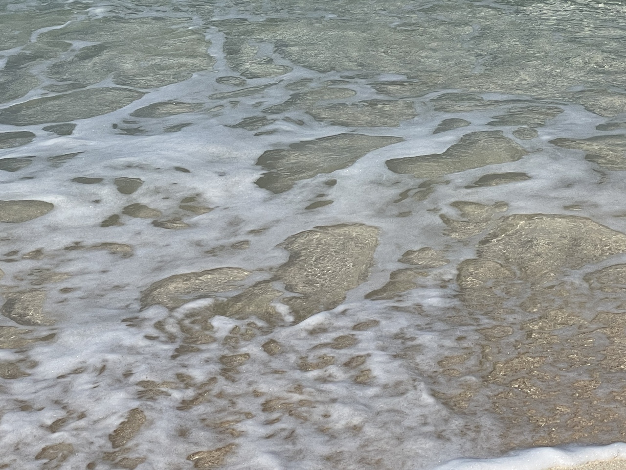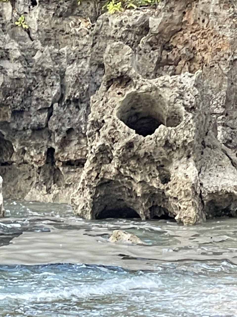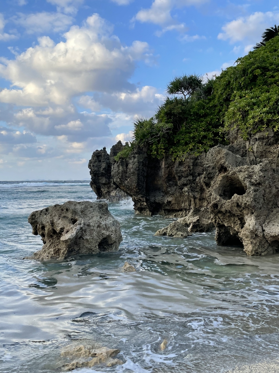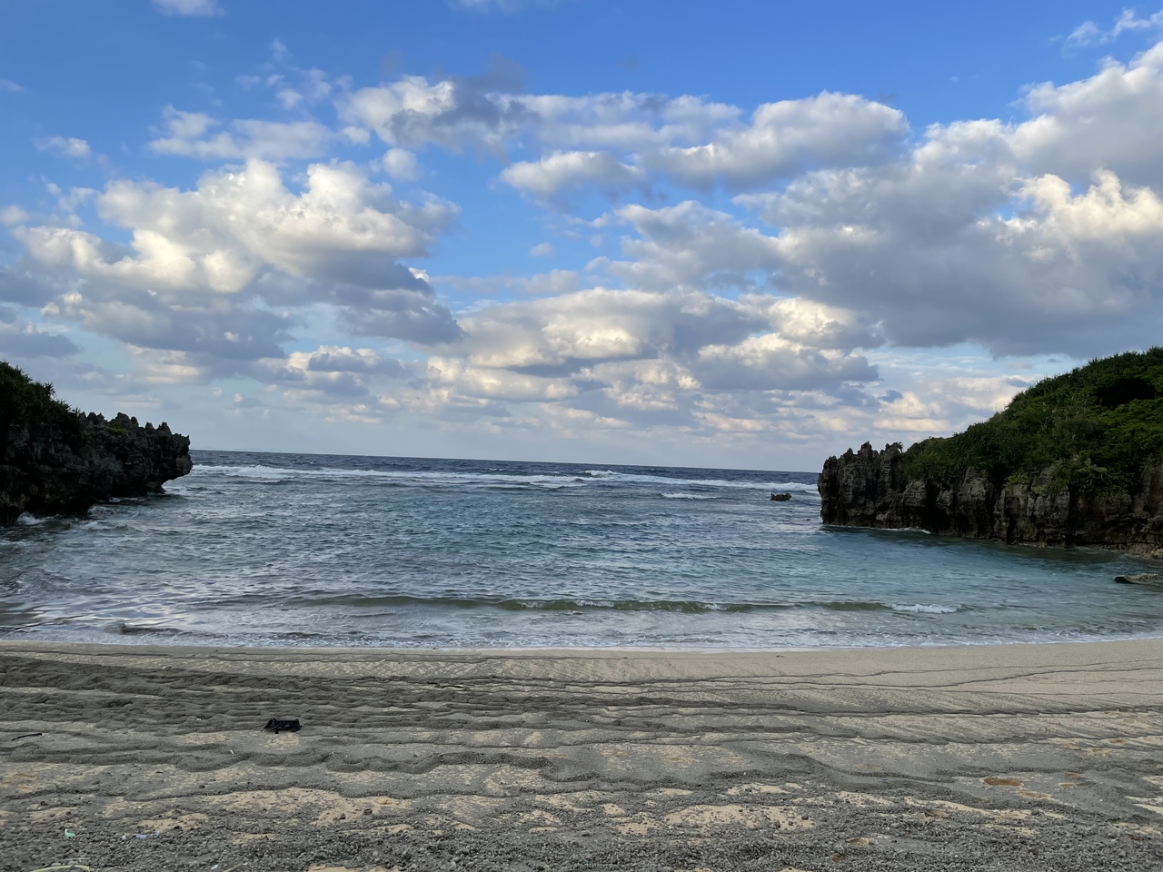 古宇利島のハートロックのあるティーヌ浜の近くにあるビーチです。小さなビーチですが、ハイビスカスが咲いていたり、岩にぽっかり穴の空いた円筒状空洞地形があったりします。海の水は、きれいなのですが、残念なことに訪ねた時は、砂浜に軽石があって残念でした。