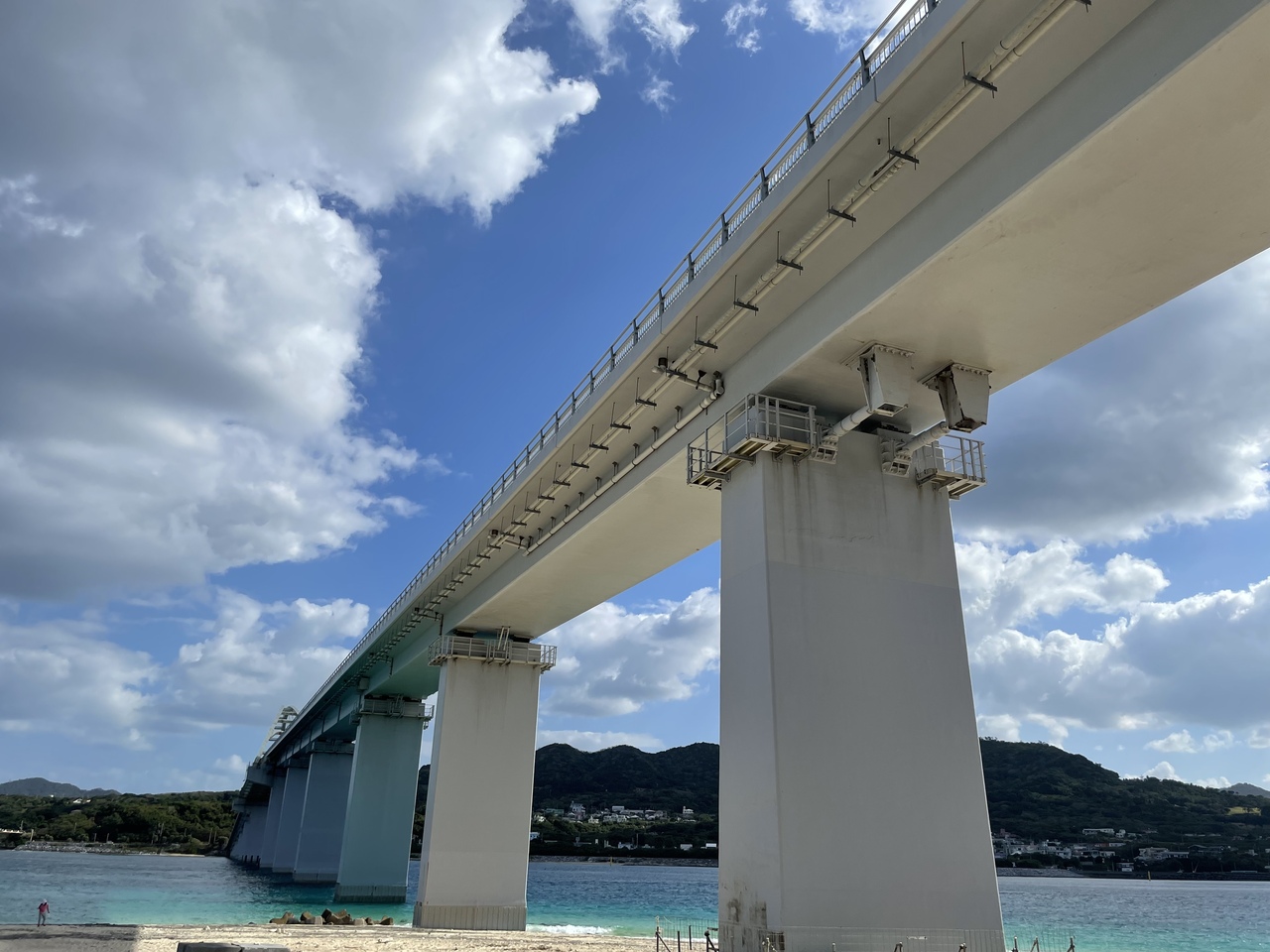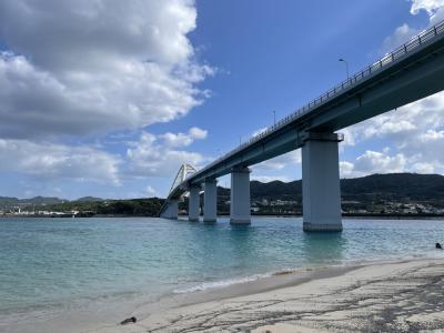 瀬底大橋のたもとのビーチです。目の前に大きな橋の見える景色は圧巻です。そしてエメラルドグリーンに輝く海はとてもきれいです。12月に訪ねた時は残念なことに、砂浜には、軽石がありました。シーズン中には、オープンするであろう海の家?は閉まっていました。すぐ近くに食堂があってかき氷を売っていました。