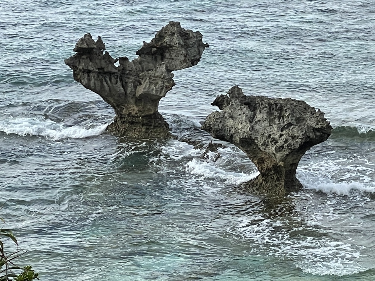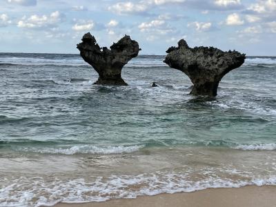 撮影現場になったりして、恋の島古宇利島の観光スポットです。車を止めるとシーズン中は多分カフェになるであろうお店があり、間の道を降りていくとハートの岩が二つ見えます。本当は3つ見えるところがあるそうですが、その場では、わからず、後日テレビを見ていたら、岩と岩の間がもう一つのハートに見える地点があるということがわかりました。