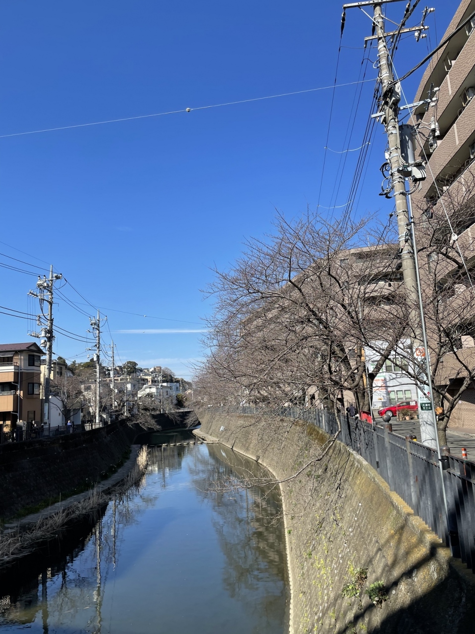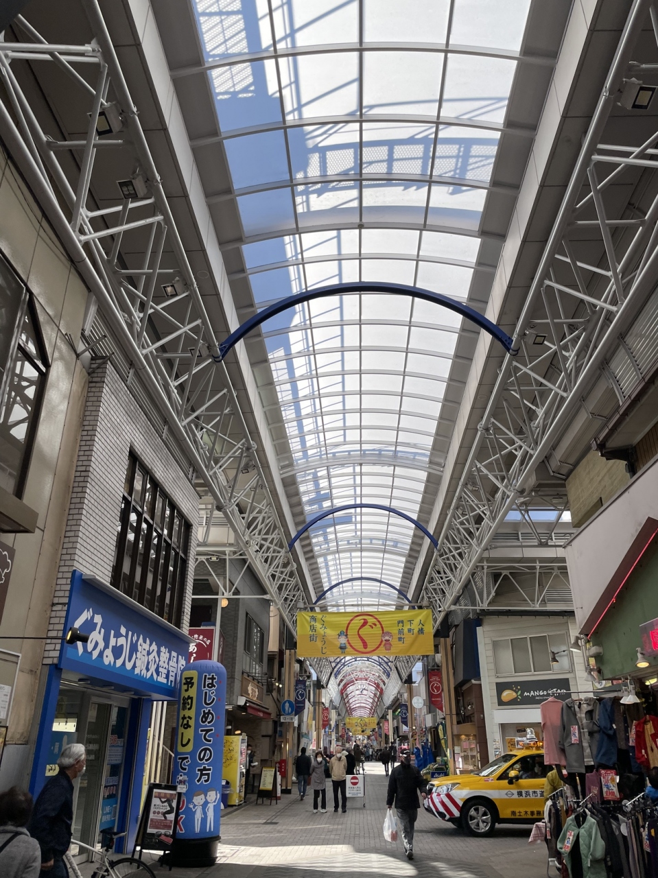 弘明寺から続くアーケードの商店街です。八百屋さんや豆腐屋さん、和菓子屋さんにパン屋さん、洋服屋さん、花屋さんなどいろいろなお店が入っていて、適度に賑わっていて楽しいです。途中にある川沿いに桜が咲くときっときれいなことでしょう。