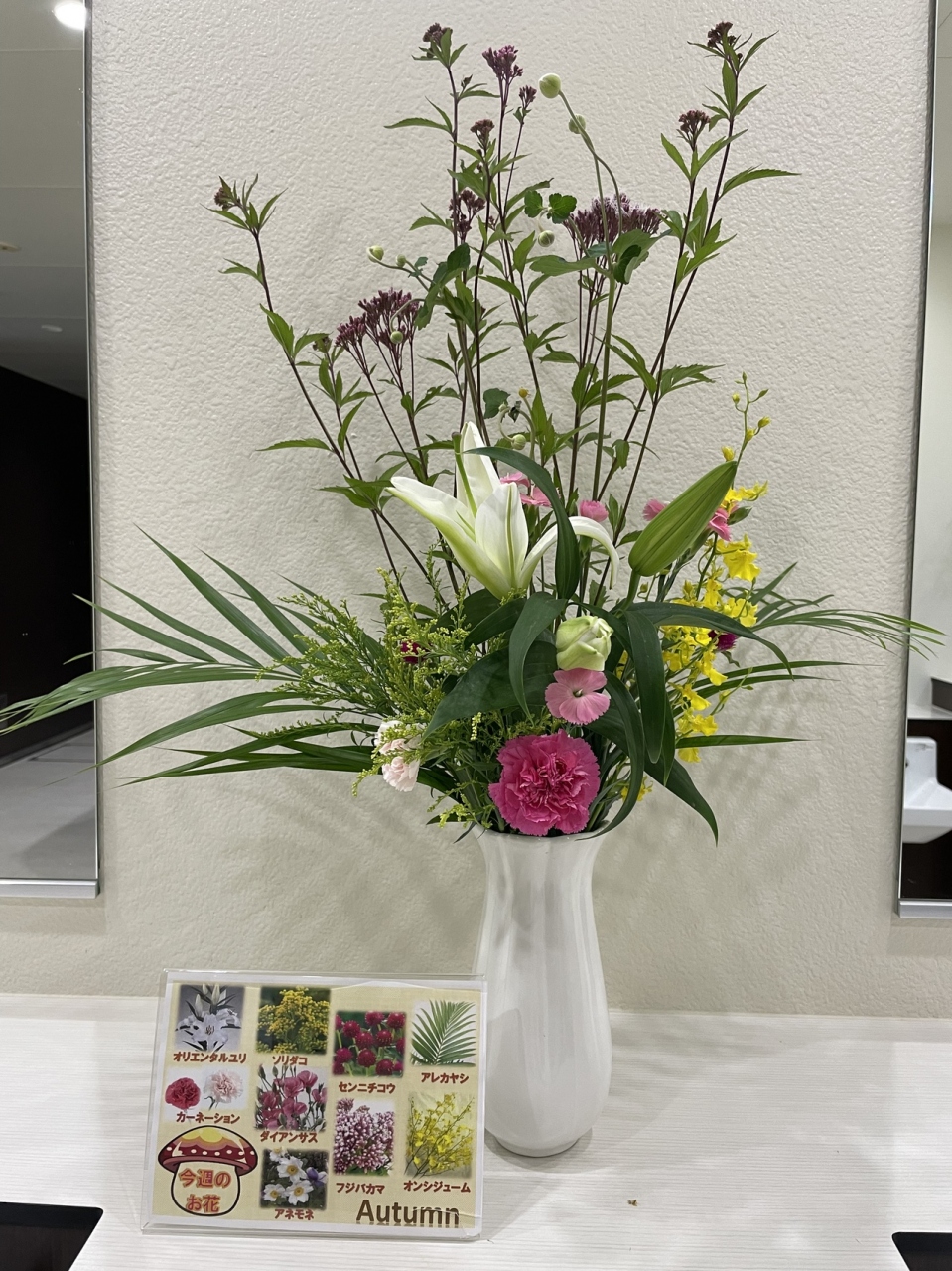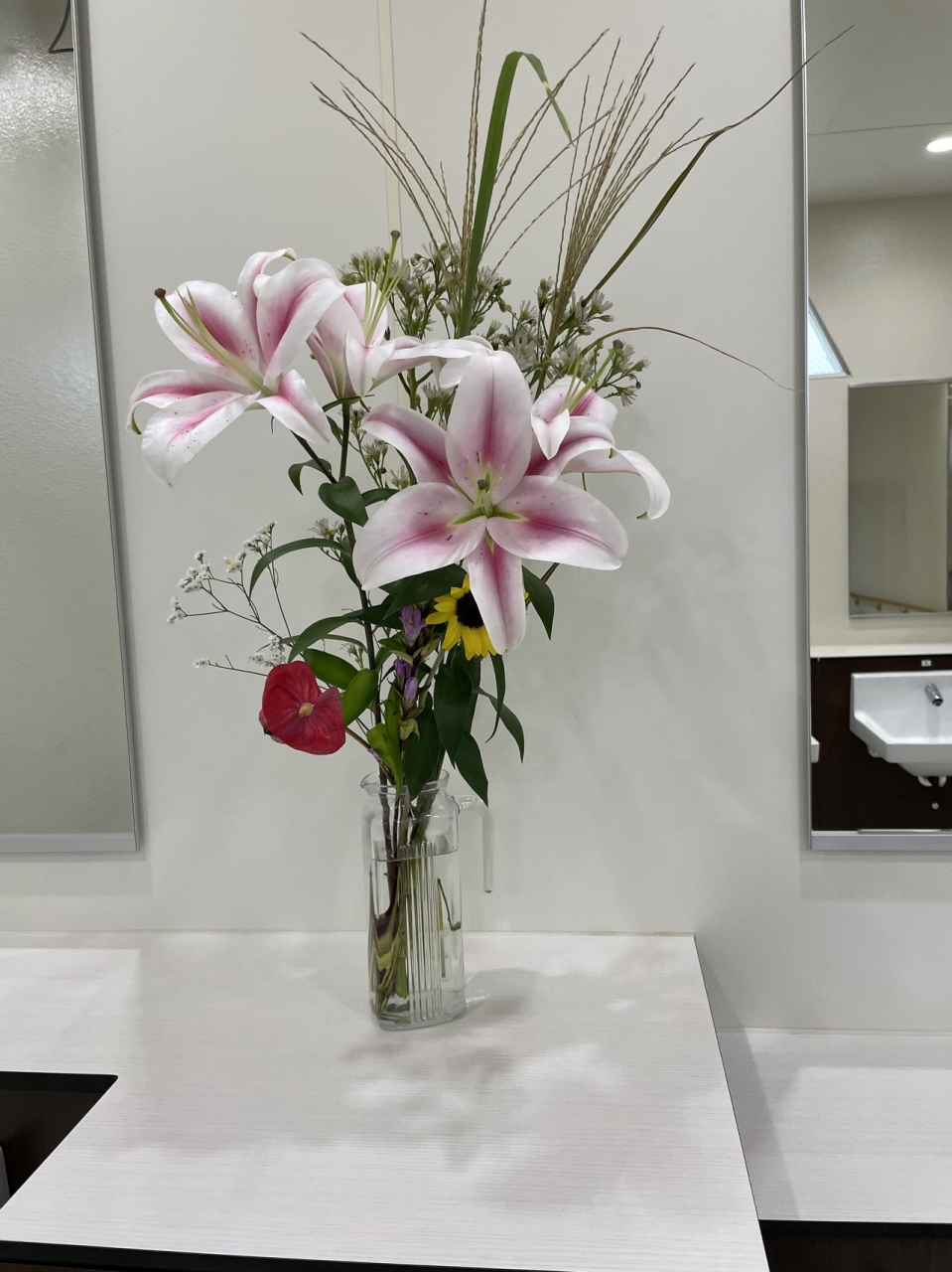 長野インターから入ってすぐのパーキングエリアです。売店やレストランのほか野菜市場があります。松や石の置いてある芝生エリアの庭園もきれいですが、トイレにいけてあるお花もきれいでした。今週のお花といういけてある花の説明写真も掲示してあります、毎週花が変わるんですね。今週は百合の香りが漂っていました。
