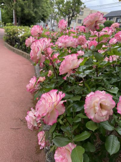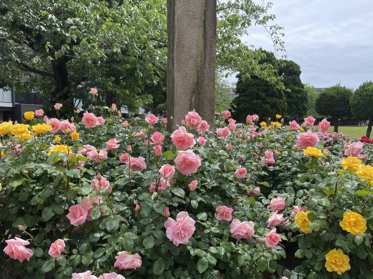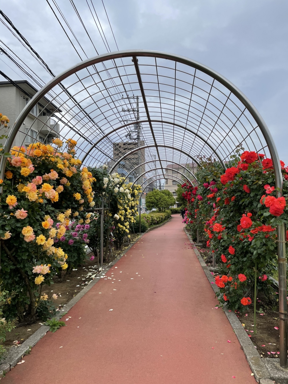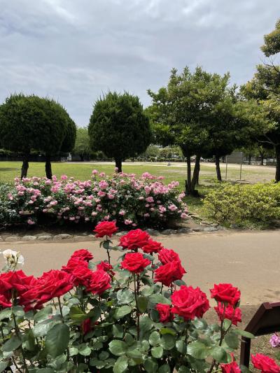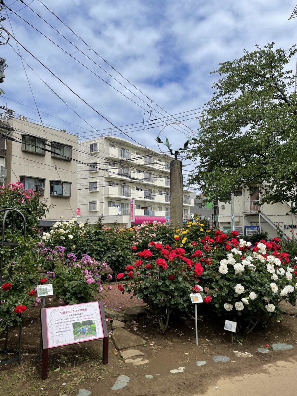 東京メトロ東西線行徳駅近くの街中にあります。公園の駅寄りの角にある小さなバラ園の花が満開で、とてもきれいです。脇を通るといい香りがします。公園に遊びに来た人や通りがかりの人が眺めて楽しんでいるようです。