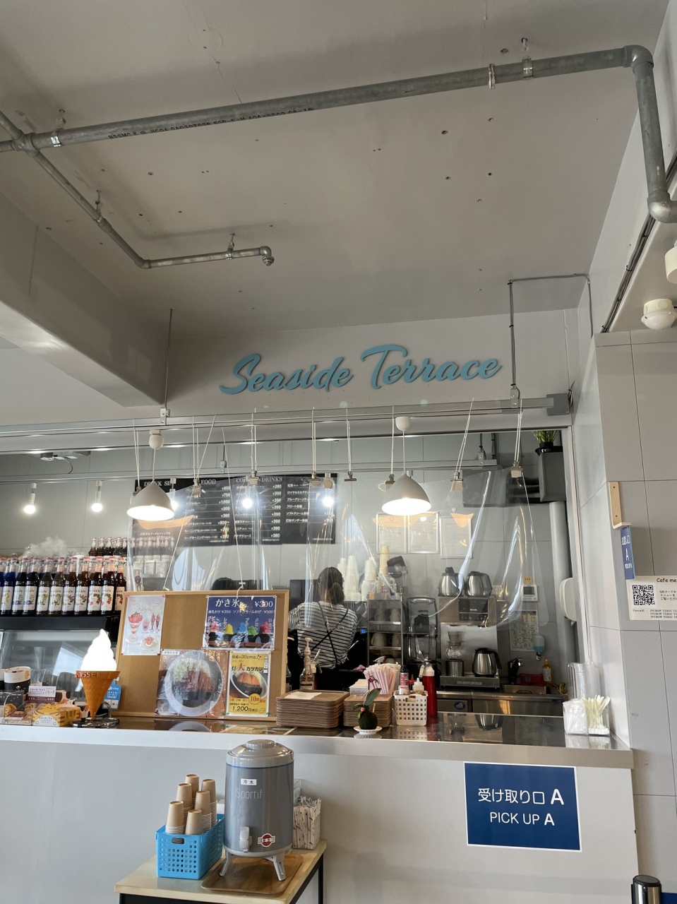 犬吠テラステラス1階にあるカフェです、海に面した庭に向かってカウンターがあり、眺めがいいです。店内は、開放的で明るい印象です。コーヒーなど飲み物のほか、ソフトクリームやパフェ類もあります、食事もできます。自分で注文して運ぶスタイルです。