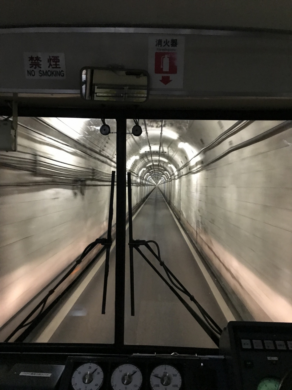 全て、トンネルの中を走るかんきょうに優しいトロリーバスです。来年4月から、新しい電気バスにかわるそうです。土砂が噴出し続け、トンネル工事に苦労した破砕帯の部分の色が違っていてわかるようになっています。