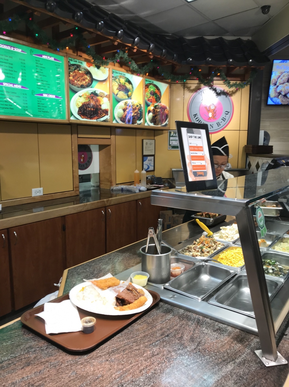 アラモアナセンターのフードコートにあります。注文すると、受付番号の書いてあるレシートをもらい、頼んだものができあがるまで、待ちます。カルビのミニプレートをたのみましたが、付け合わせの惣菜をショーケースの中から、2種類選べました。カルビの焼肉は、柔らかく味付けもおいしかったです。豆腐のスープも頼みましたが、辛いのと、マイルドなのと、どちらかを選べました。具沢山で量も多かったです。