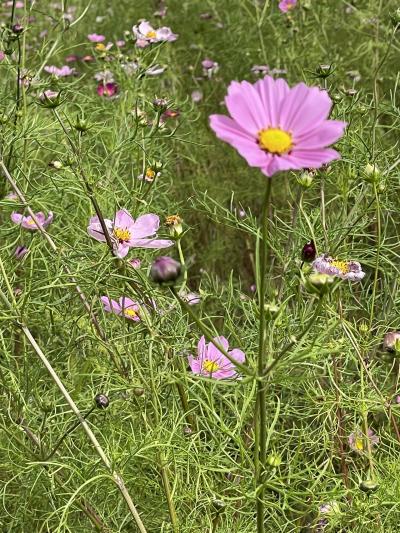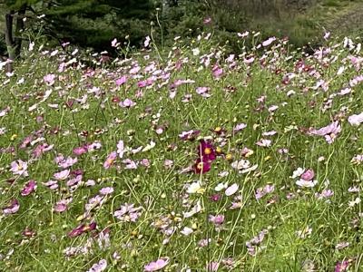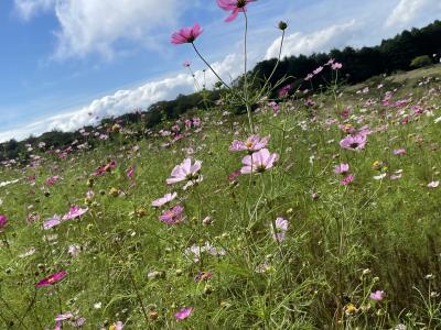軽井沢の帰りに寄りました。佐久市だから、そんなに遠くないだろうと訪ねましたが山道をずんずん走り、本当にコスモス畑があるのかな?と、だんだん不安に…駐車場に止めても、まだ見えない。どこ?と歩き始め、池の向こうに見えた一面のコスモス畑。満開のコスモスが見られてよかったあ! 荒船山始め周りの山々も絶景です。