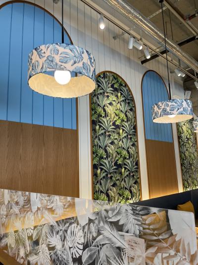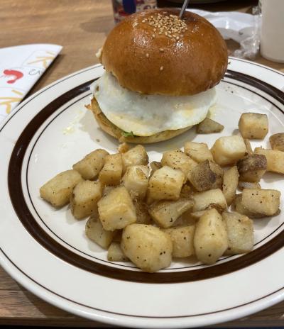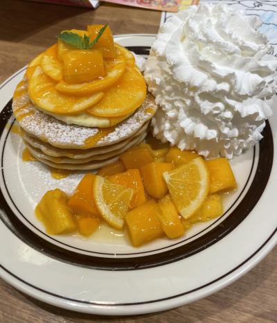 日本にも何店舗もありますが、元々はハワイのパンケーキ屋さん。モリモリのクリームがトッピングされているパンケーキです。そのクリームの量の多さに孫たちは感激。テーブルに備えてあるイチゴソースや、メープルソース、ココナッツソースなどをかけて堪能していました。テーブル席やソファ席、大きなカウンター席などがあり、インテリアは、ハワイ。仕切りとなるアクリル板までも。娘とハワイの店舗の話で盛り上がりました。子どもには、ランチョンマットの裏が塗り絵になっていて、クーピーを貸してもらえます。