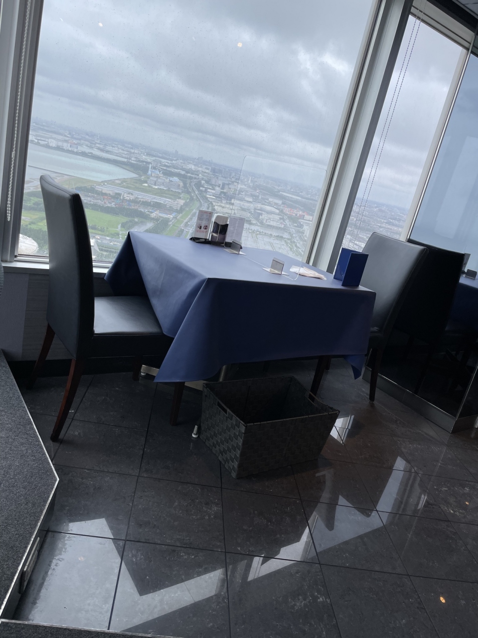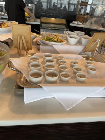 アパホテル幕張のセントラルタワー50階にあるレストランです。窓際にずらっーとテーブルがあるので、どの席からも外が見えるようになっています。訪ねた日は、あいにくの天気で残念だったのですが、過去何度か利用したことがあるので、天気がいいととても気持ち良いです。料理はビュッフェで、ビニル手袋をはめて、自分で取り分ける形式でした。タイムサービスといって、決められた時間に、サーモンマリネだとかローストビーフだとかショートケーキだとかを並んで取りに行くようになっていました。