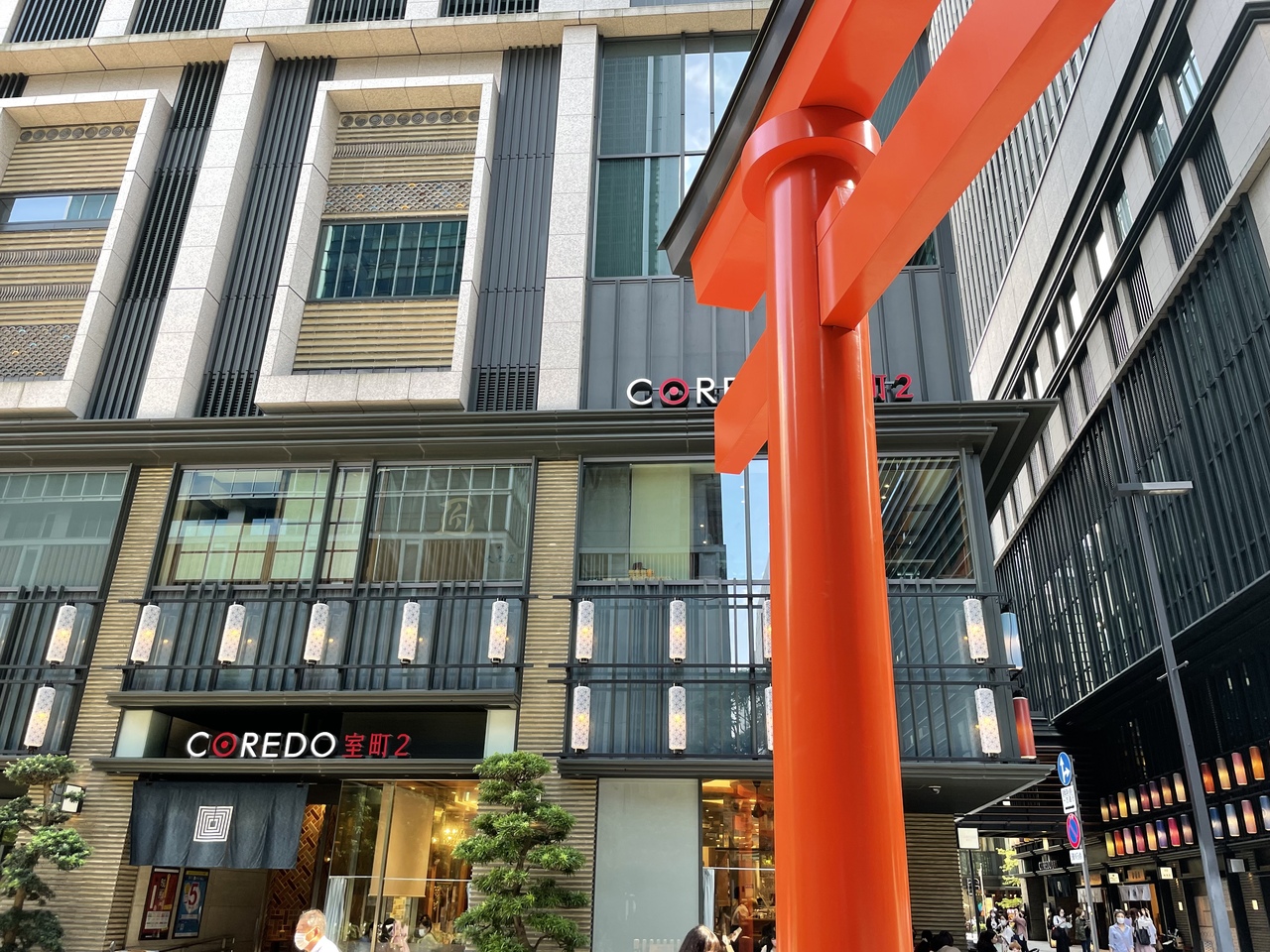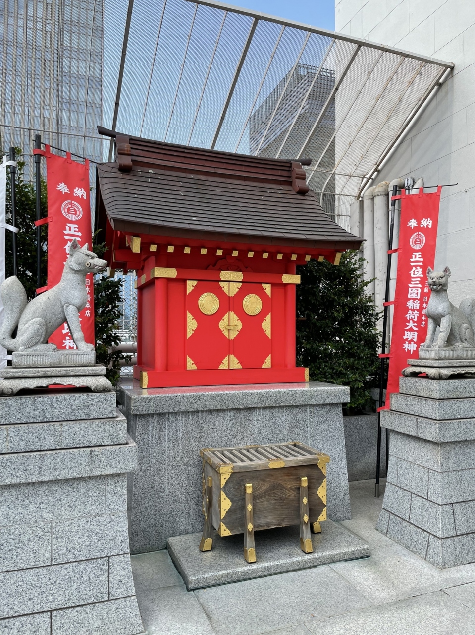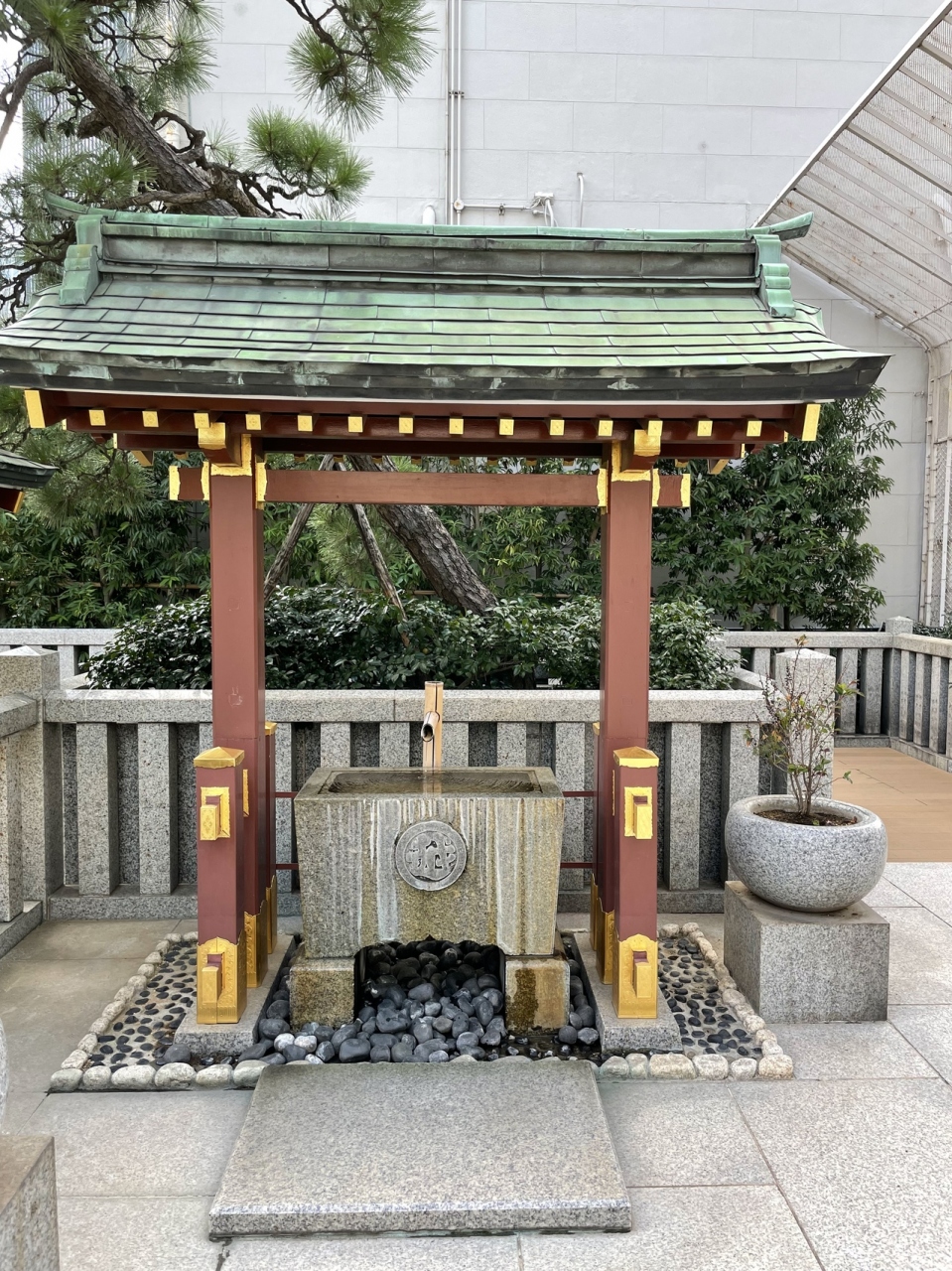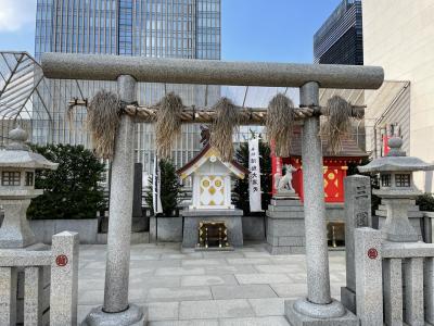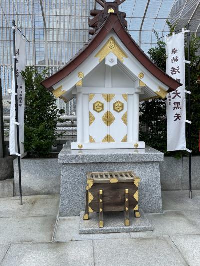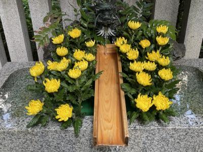 コレド室町のすぐ近くにあります。都会の景観に赤い鳥居が溶け込んでいるようです。伺った時は、黄色い菊の花の花手水でした。9月9日が重陽で菊の節句だからだそうです。宝くじが当たるようにということで宝袋は、知っていましたが、限定の旅守りもありました。