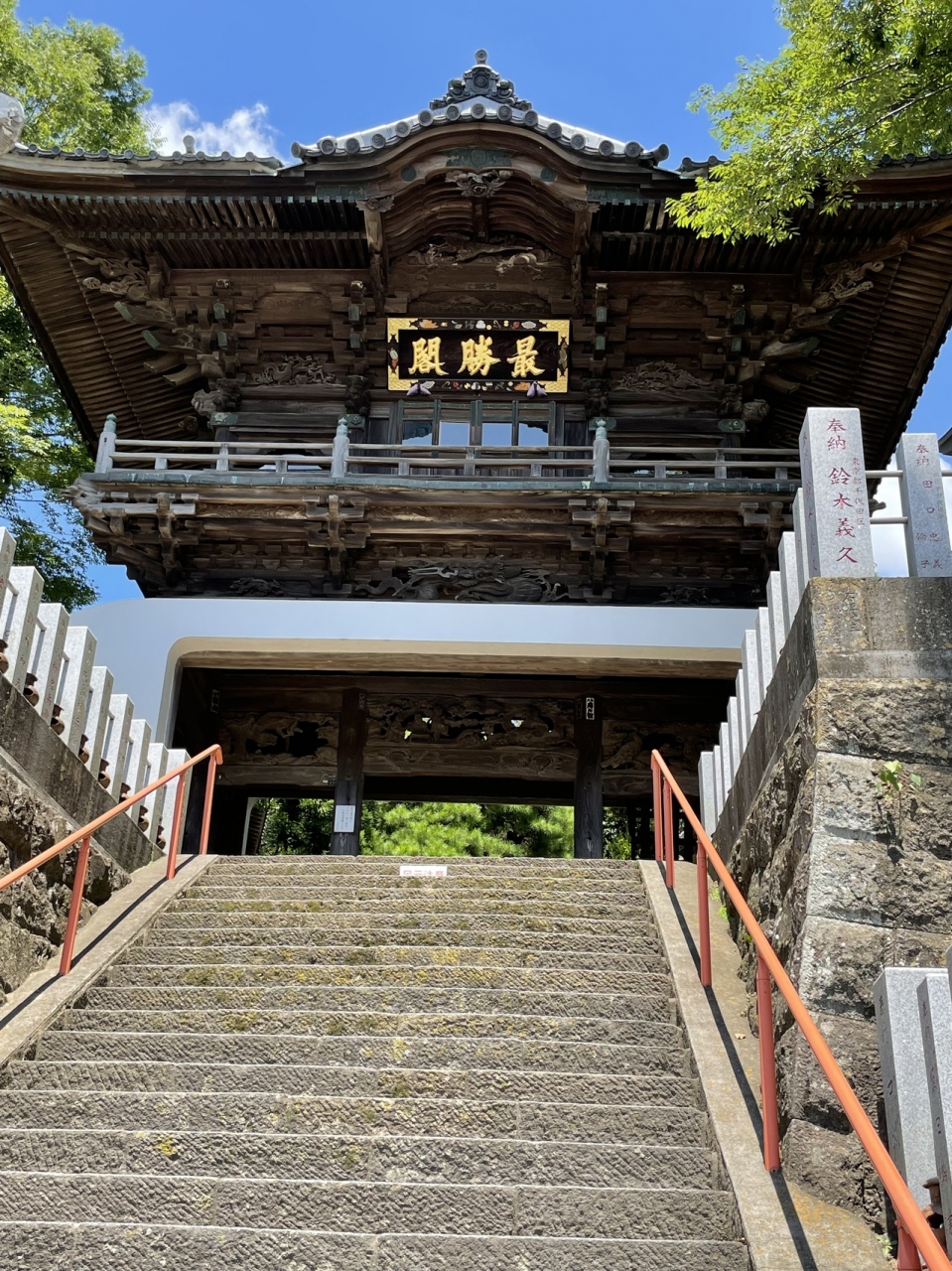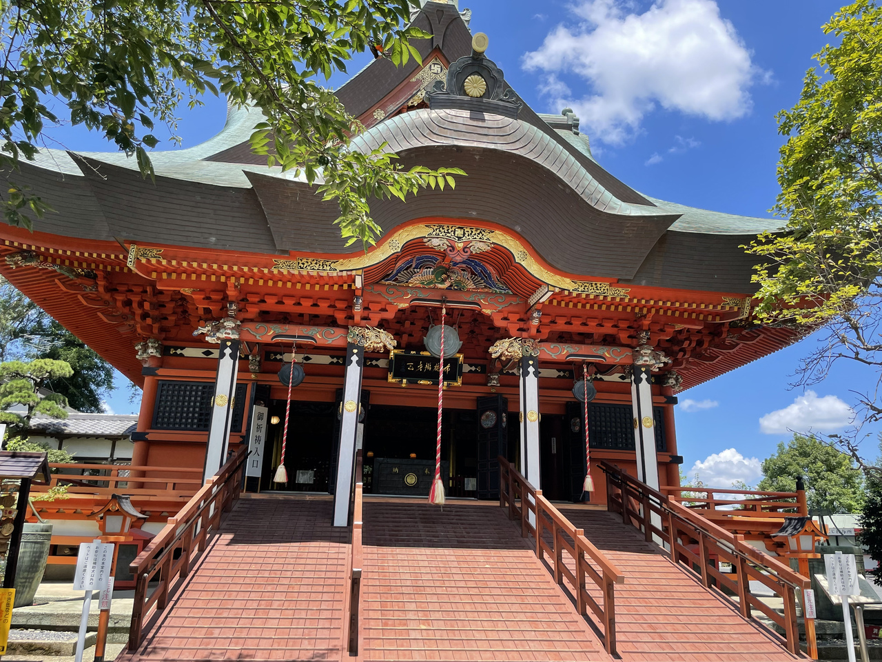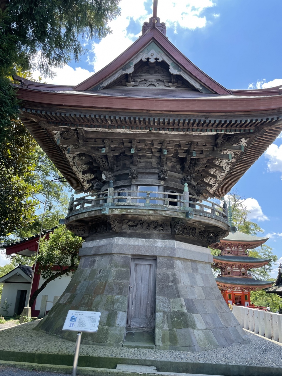 あけぼの山農業公園のすぐ近くにあります。石の大きな鳥居をくぐって階段を上るとすてきな門があります。いろいろな彫刻の施された門の中には四天王様がいらっしゃいます。本尊は弘法大師様がおつくりになったとされる観音様だそうです。鐘楼や三重塔などもある大きなお寺です。歩いて1分くらいのところにある少し離れたところに、境内社?もあります。