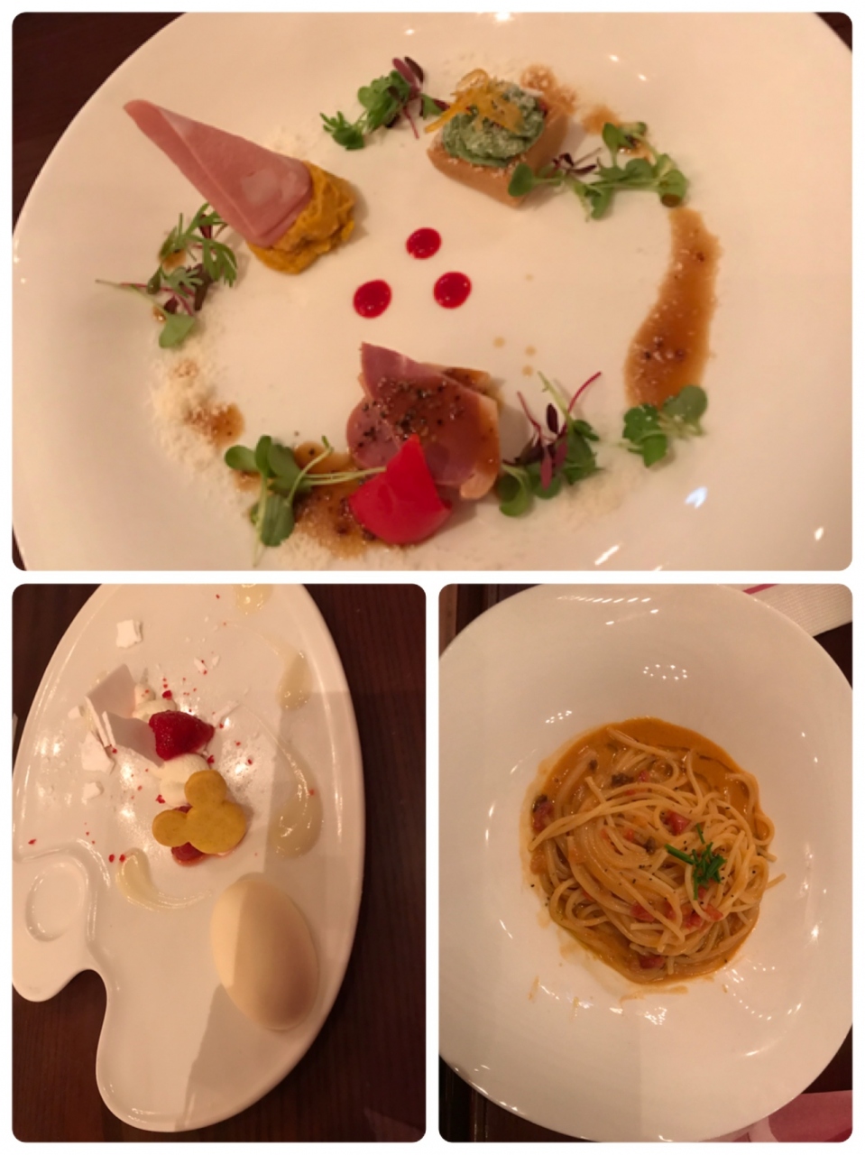 ディズニーシーのイタリアンレストランです。落ち着いた雰囲気のレストランでゆっくりできます。今回はパスタセットを食べたのですが、ピザもおいしいです。室内のほか運河に面したテラス席もあります。夜になるとテーブルにあかりがともり、ムーディになります。
