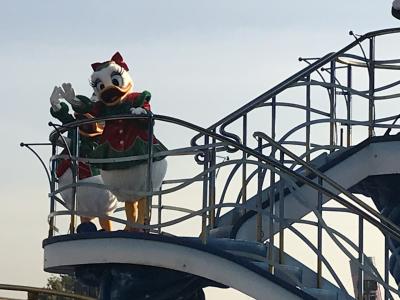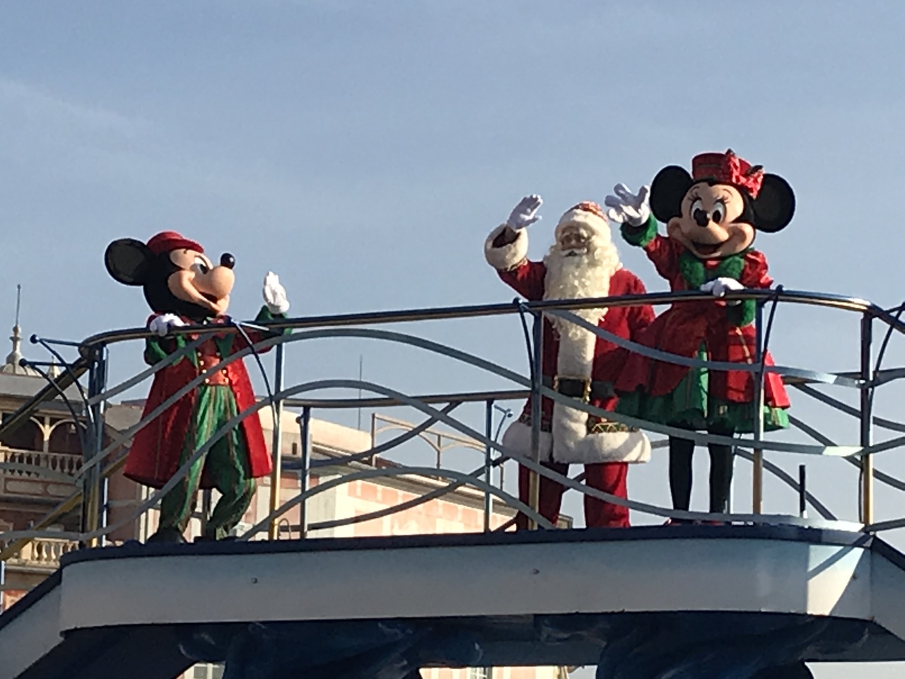 ディズニーシーの真ん中にある広いハーバーです。今までいろいろなイベントが行われていますが、今は、ミッキーの仲間たちのクリスマスのグリーティングが行われています。ハーバーのまわりの観覧場所に、黄色いラインに囲まれた四角や白い点が、描かれていて、そこに立ってソーシャルディスタンスをとりながら、観覧するようになっています。船に乗ったクリスマスコスチュームのミッキー、ミニー、ドナルド、デイジー、ダッフィー、シェリーメイ、サンタさんが、クリスマスソングにのって、踊ったり、手を振ってくれたりします。