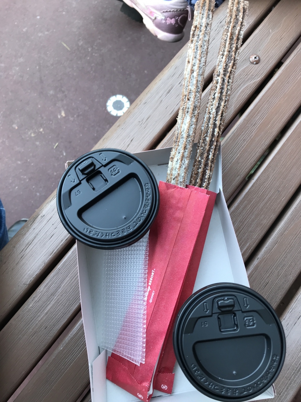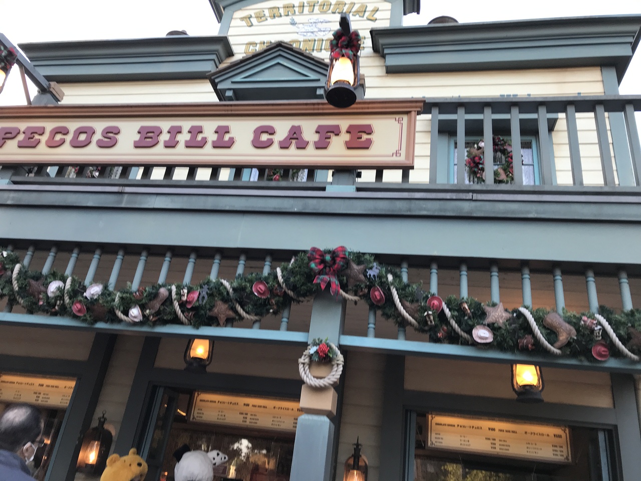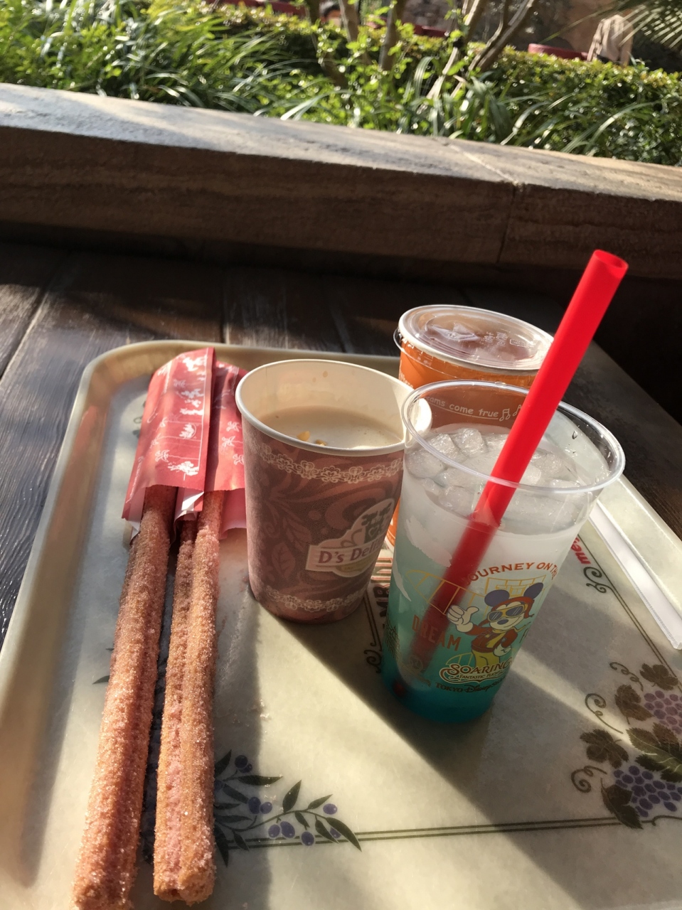 ディズニーランドのベアーズジャンボリーのすぐ近くにあるカフェです。メニューは、ポークライスロールとチョコレートチュロスの他に飲み物です。イートアウトというか注文したものをカウンターで受け取り、すぐ近くの外にあるテーブルやベンチで食べたり飲んだりすることもできるし、周りに結構ベンチがあるので、座らこともできます。小腹が空いた時、気軽に注文でき、便利です。