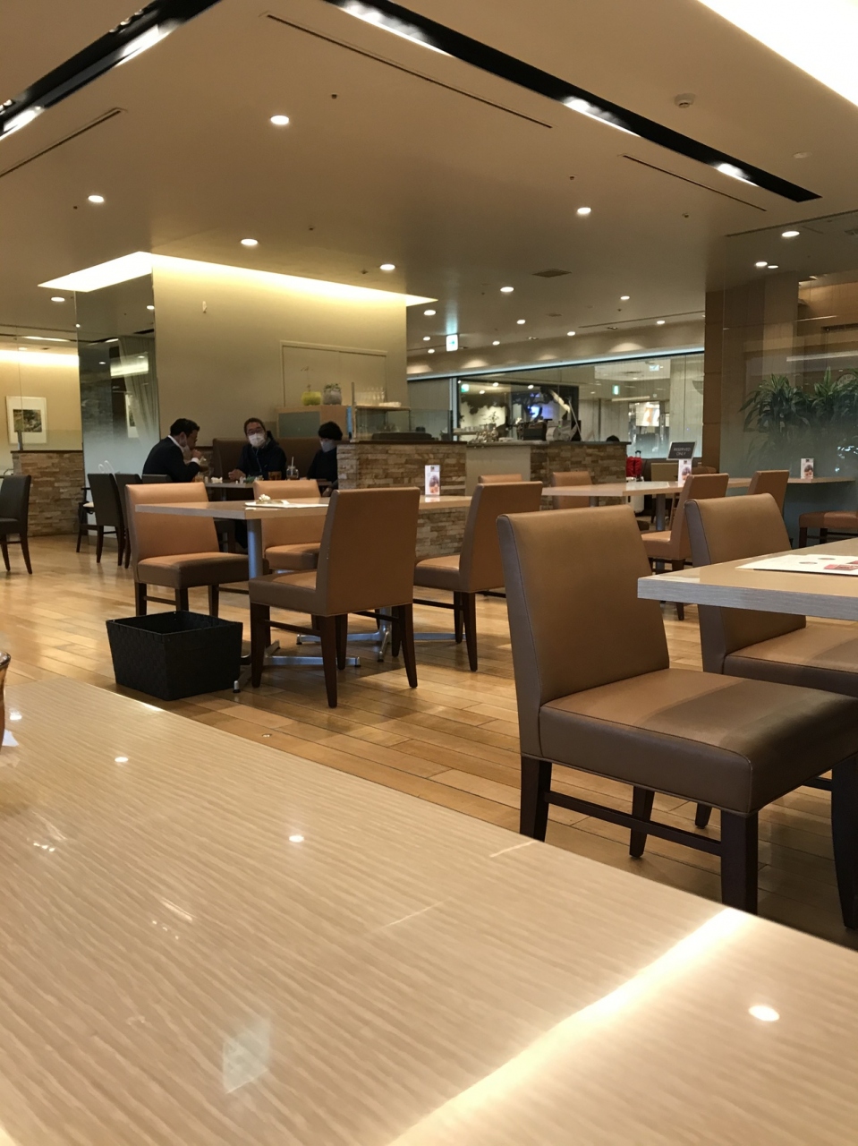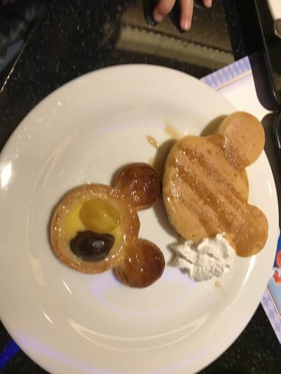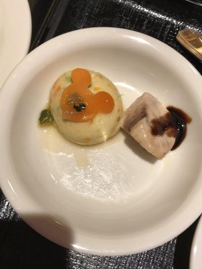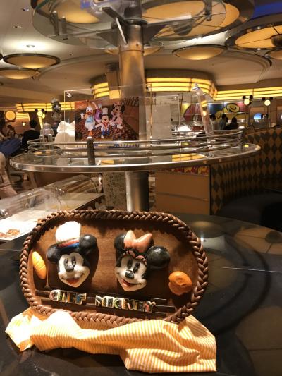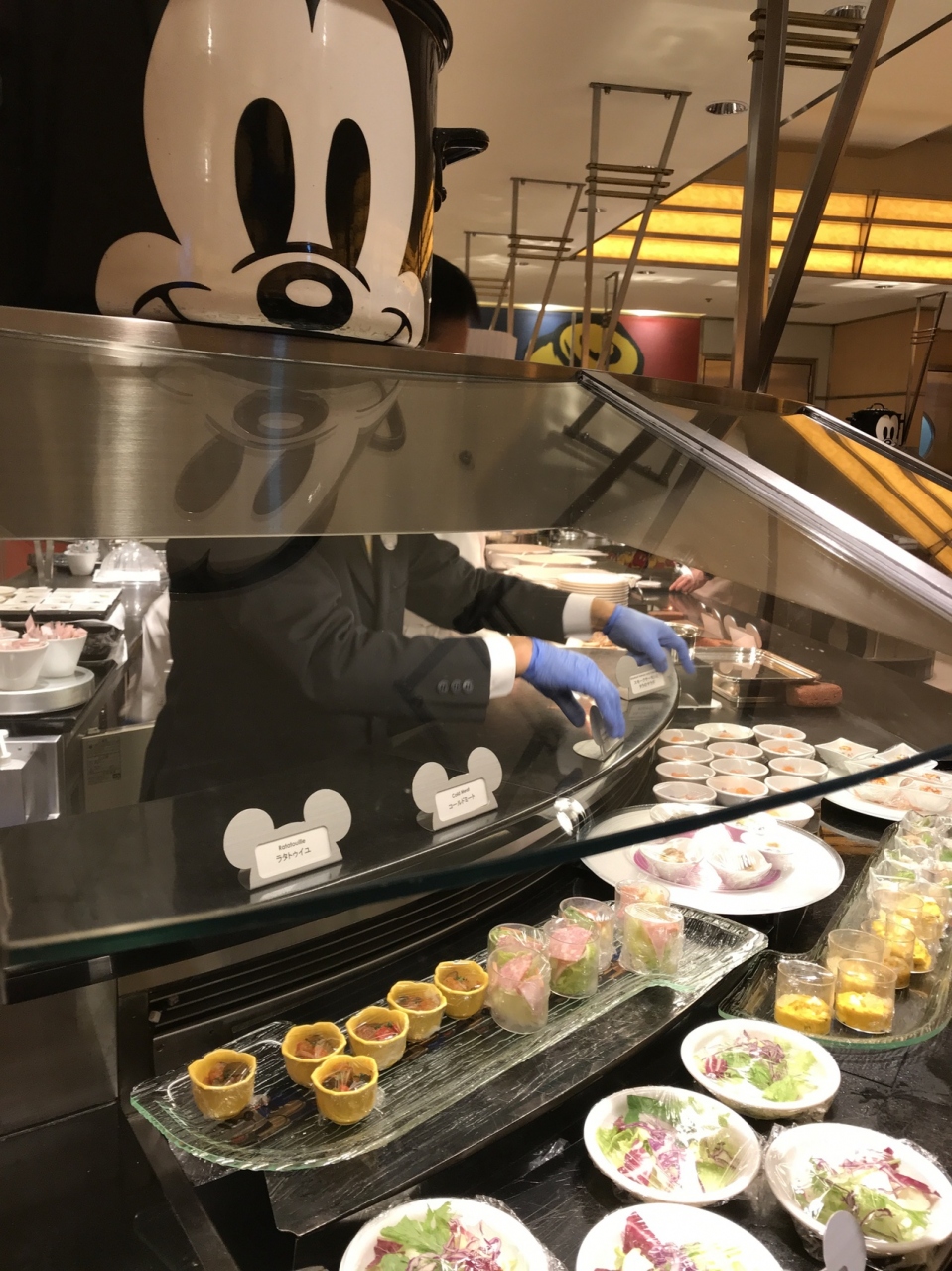 ディズニーアンバサダーホテルの1階にあるビュッフェレストランです。本来なら、ミッキーやミニーなどディズニーのキャラクターのグリーティングがあるのですが、残念ながら今はコロナ感染予防のため、キャラクターは登場しません。その代わり、予約がとりやすくなりました。ビュッフェは、マスク着用、アルコール消毒をして自分でとりにいくのですが、それぞれの料理のところにスタッフがいて、盛り付けたり、切り分けたりしてくれます。小鉢類には、ラップがかけられていました。室内だけでなく、料理のいろいろなところにミッキーがいて楽しめました。子どもが喜んでたくさん食べました。