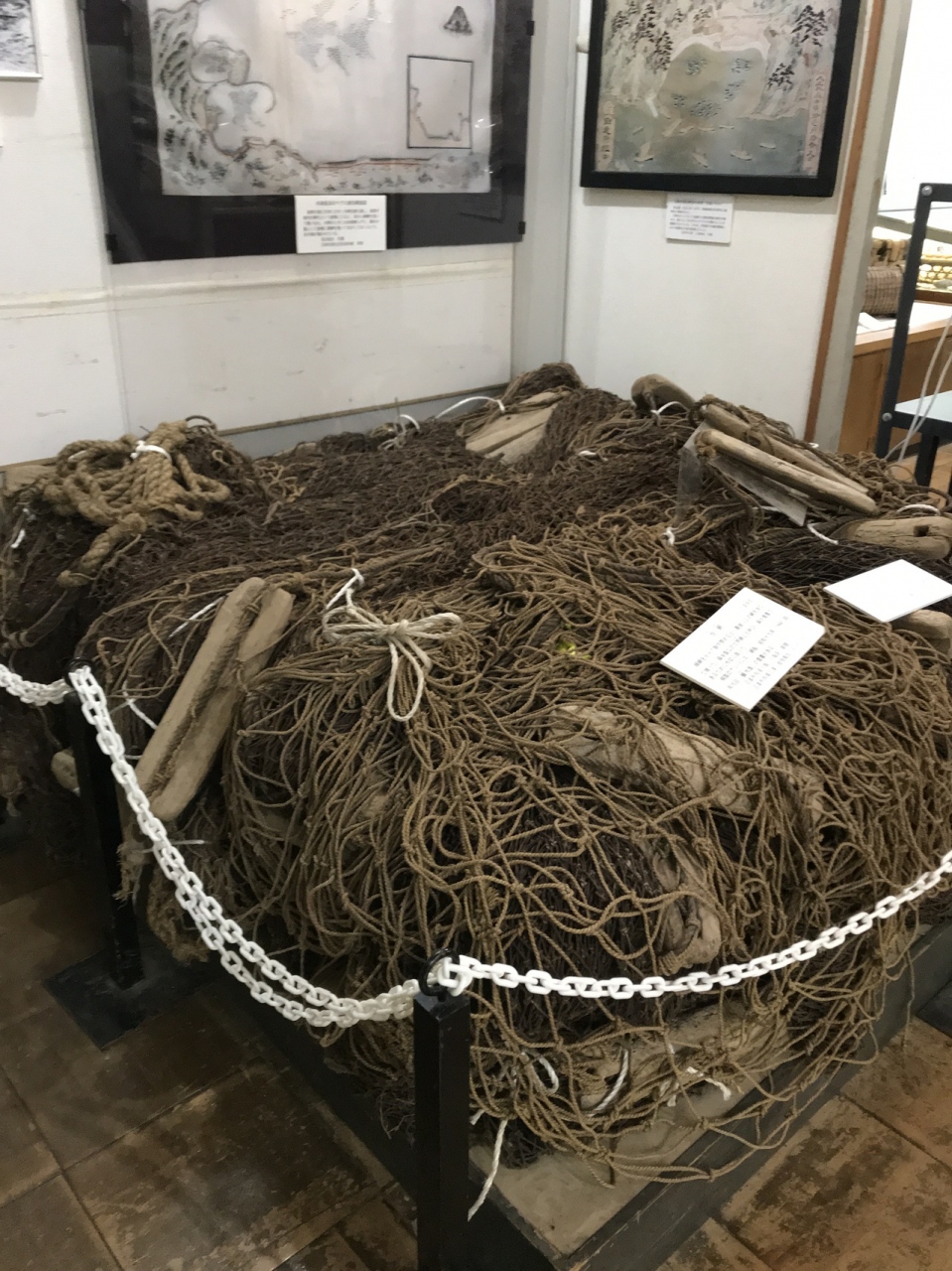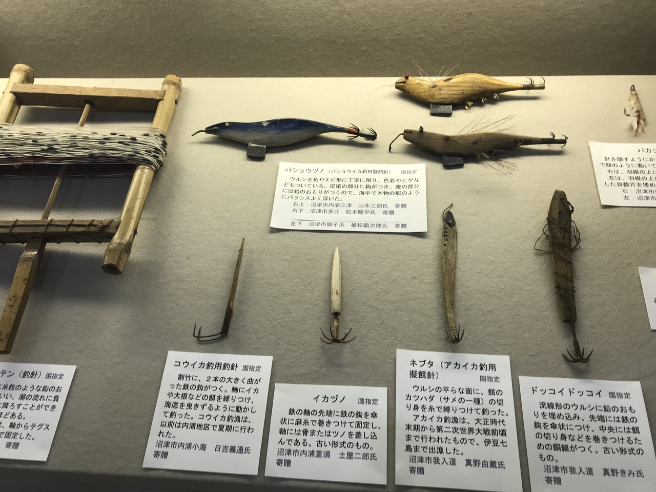 沼津の御用邸記念公園の中にあります。木々に覆われたすてきなところにあります。展示は、漁業に関する物が中心でした。網や、舟、樽や針など。いろいろな魚を釣るための道具や釣り方の説明などが展示してありました。