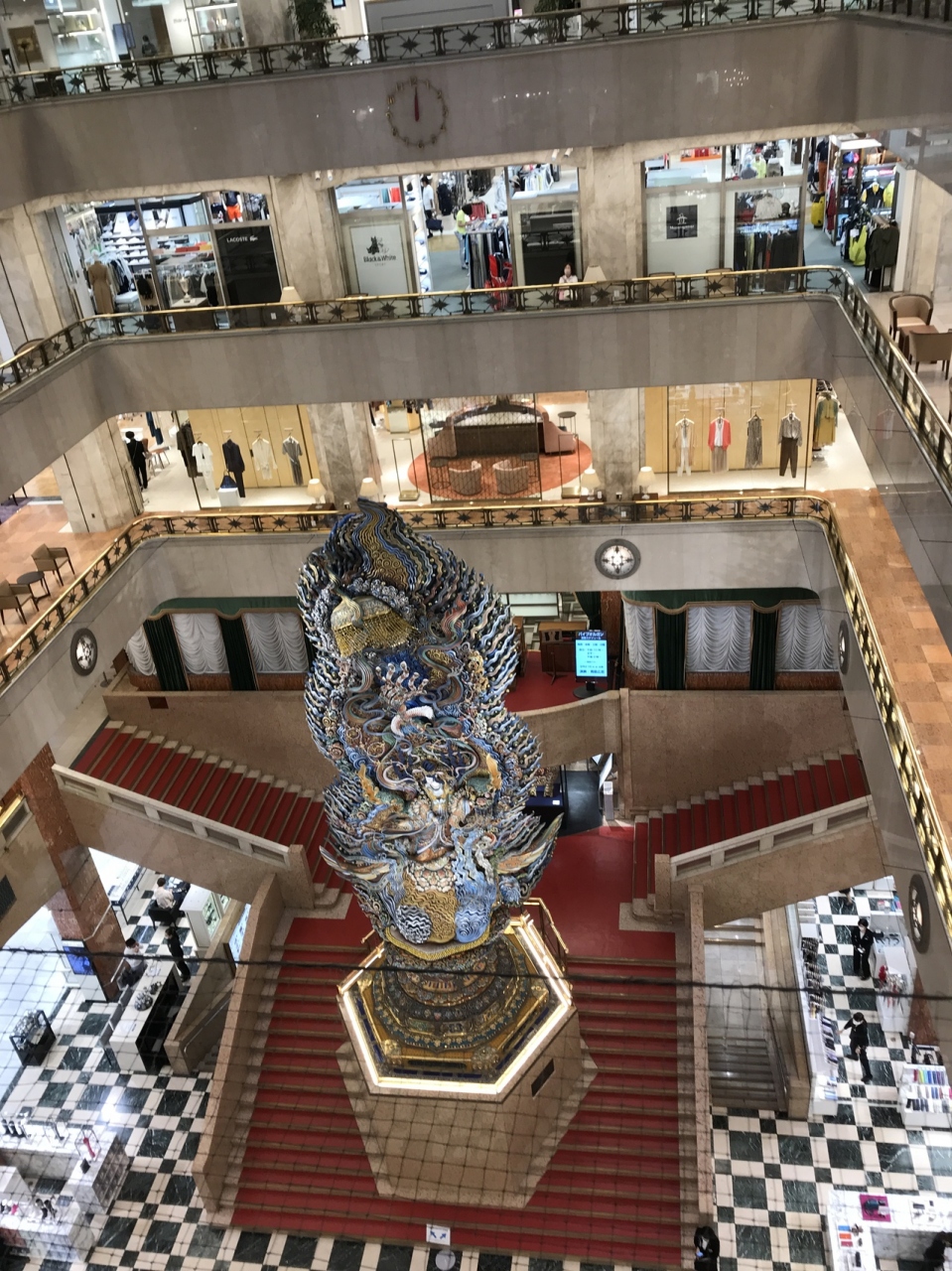 日本橋のすぐ近くにある日本最初のデパートです。正面玄関の脇のライオン像は、有名ですが、1914年に設置されたそうです。ルネッサンス式建築の現在の建物は、1935年に完成したもので、1階から吹き抜けになっていて大きな天女像があり、目を引きます。パイプオルガンもあり、週末は、きれいな音色を響かせています。店内ツアーも第2土曜日に、行っています。今日初めて知ったのですが、大理石の階段や壁には、化石がたくさん含まれているそうです。実際に、アンモナイトやベレムナイトを見ました。目が慣れてくると色々なところにあるのがわかって面白いです。たまたま今日訪れた時に、吹き抜けのところでパンフレットをもらい簡単な説明を受け、初めて知りました。