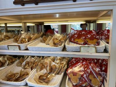 ディズニーランドのパン屋さんです。かわいいキャラクターのパンやスウィーツがたくさん。飲み物などと共に外のテーブルで食べることも持ち帰ることもできます。自分で好きなパンを取ってレジで買うスタイルです。遅い時間に行くとパンの種類が少なくなってしまいます。