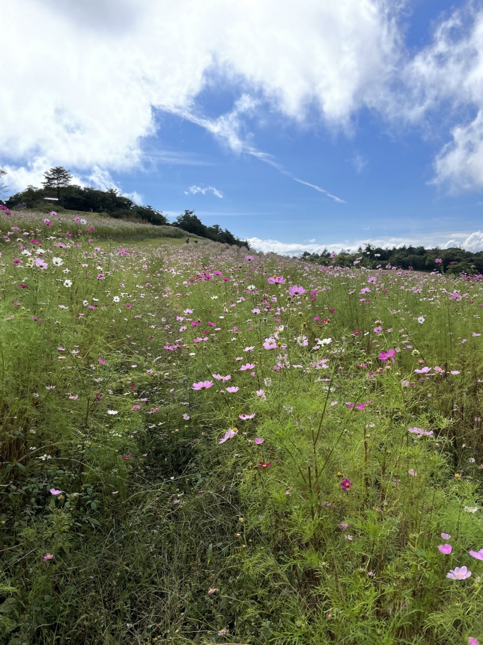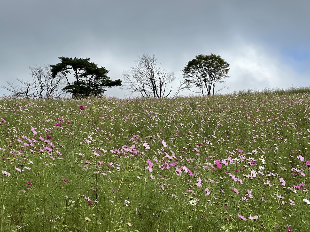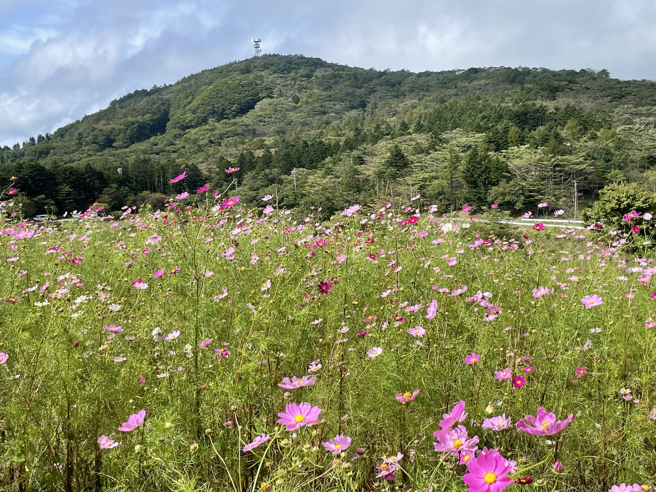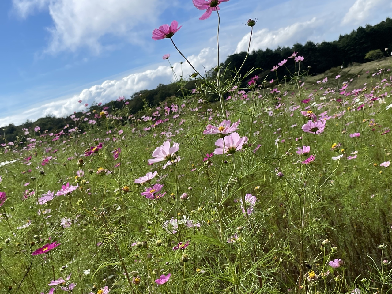 軽井沢の帰りに寄りました。佐久市だから、そんなに遠くないだろうと訪ねましたが山道をずんずん走り、本当にコスモス畑があるのかな?と、だんだん不安に…駐車場に止めても、まだ見えない。どこ?と歩き始め、池の向こうに見えた一面のコスモス畑。満開のコスモスが見られてよかったあ! 荒船山始め周りの山々も絶景です。