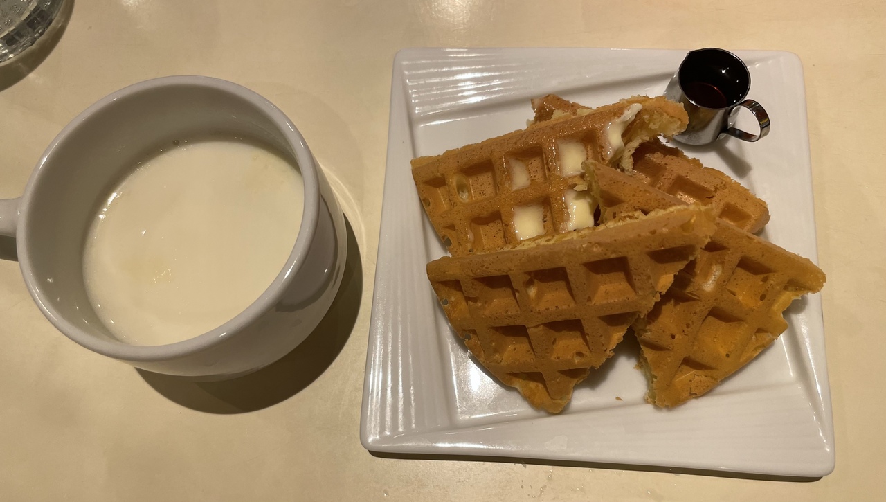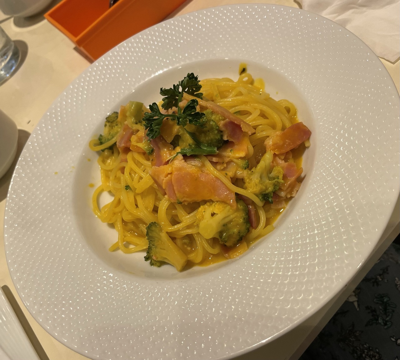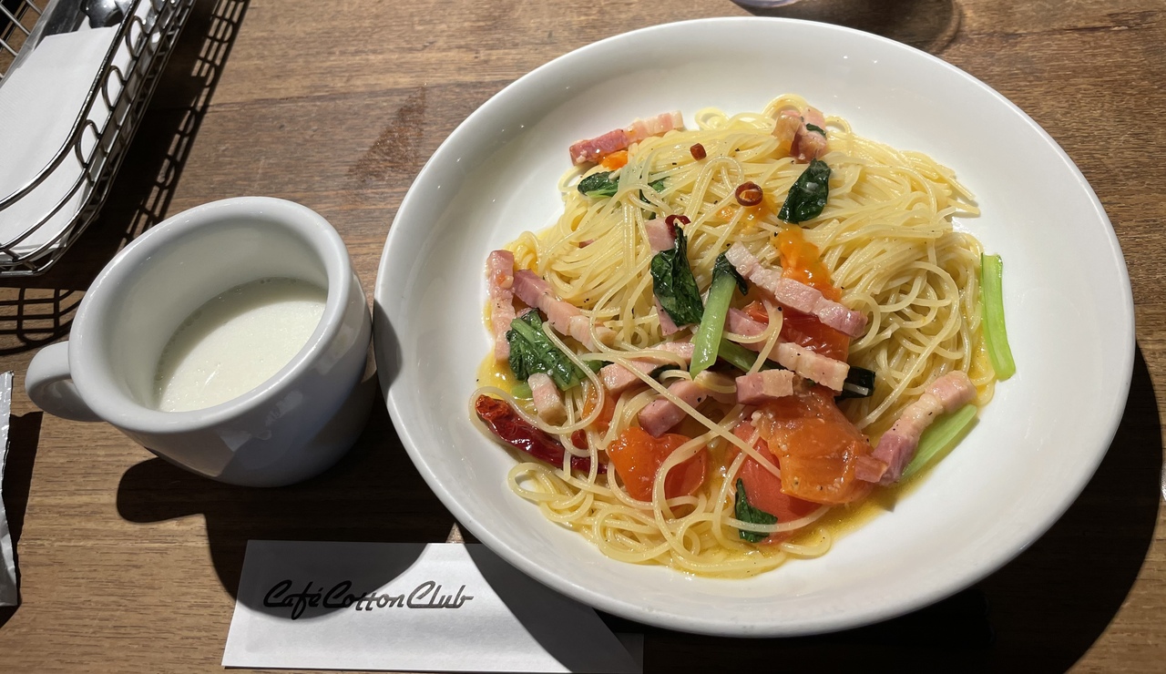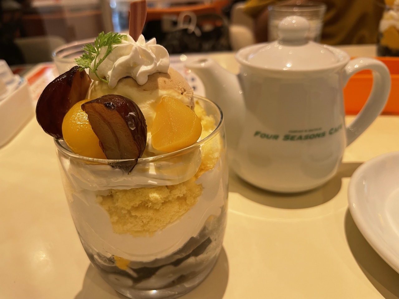 東京メトロ東西線西葛西駅近くにあるカフェです。メニューから好きなものを食べられるだけ選ぶ食べ放題のお得なコースもありますが、年齢的に?そちらは、もう無理。お得なセットにしました。スープ、ミニワッフル、パスタ、ミニデザート、飲み物です。別腹のミニデザートは、季節のおすすめマロントライフルにしました。いつも、混んでいて、時間によっては、並んでいます。今回は開店と同時に入店できたのでよかったです。