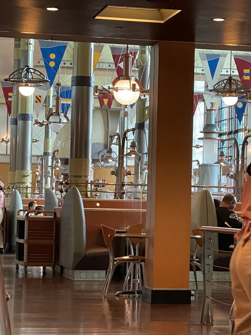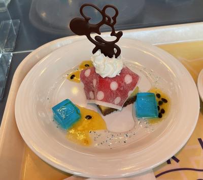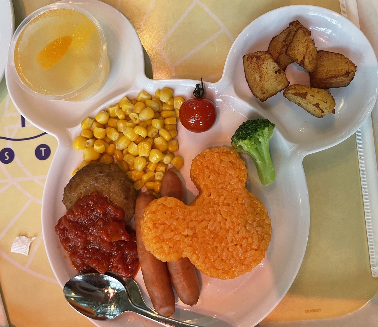 ディズニーシーのレストランです。自分で食べたいものをチョイスしてお盆に乗せ、最後にお会計をしてから、テーブルに案内されます。子連れには、ちょっと面倒くさい。でも、料理が持てないとスタッフにお手伝いしてもらえます。このレストランを予約したのは、見た目のかわいいお料理があるから。味は普通だけれど、目は充分癒されました。