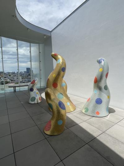 東京メトロ東西線早稲田駅から歩いて10分くらいのところにあります。ふと目を引くおしゃれなシルバーのビル、そこが草間彌生美術館です。完全予約制です。一階は、グッズ販売コーナーと一本の大きな花の作品。行きは、階段で上がり、帰りは、エレベーターで降りる一方通行になっています。写真NGの2、3階に絵画。小さいスペースなんですが、人が制限されているので、ゆっくり見ることができます。そして4階は、赤い丸がチカチカするお部屋。草間彌生さんの映像が流れます。屋上に突起物の作品。そして、1階のトイレにも赤い丸がチカチカ。草間彌生さんの感性いっぱいの美術館です。