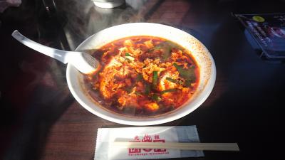 運ばれた来た辛麺のスープは結構赤い。辛さは、ちょうどいいくらい。麺はカチッとした面でおいしく頂けました…が、やっぱりここまで辛くなくてもいい。ニンニク丸ごとはちょっと考えちゃう。ただ、スープのコクと言うかうまみは…。