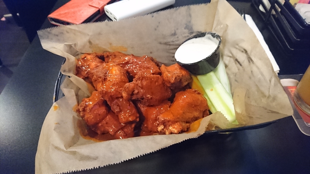 barなので、お酒とつまみ。blue moonとbuffalo wingです。