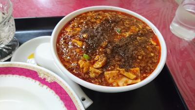 麻婆豆腐は熱々で山椒がたっぷりかかって辛い!でも、塩っぱい…。おいしいけど塩っぱい。