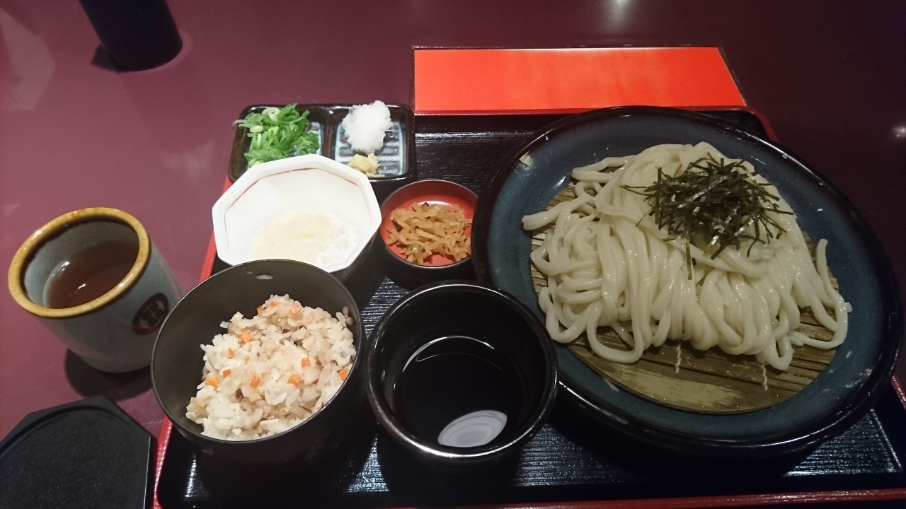 ざるうどんの定食、炊き込みご飯付き。- 旅行時期