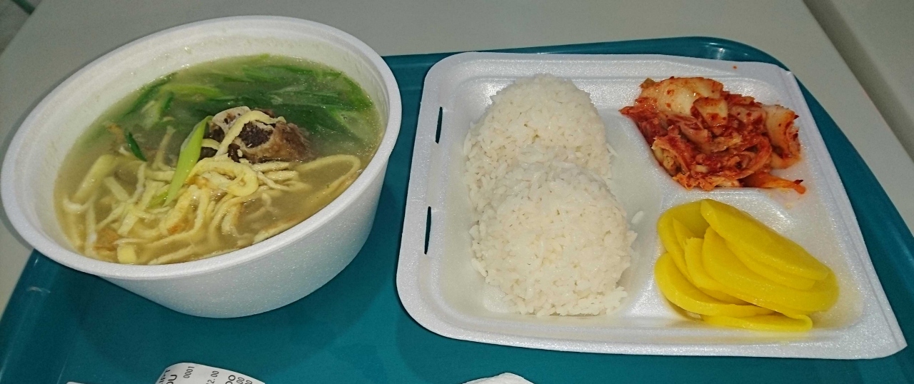 頼むのはカルビsoup。半分くらい食べたら、おまけのキムチを入れて味を変えてます。