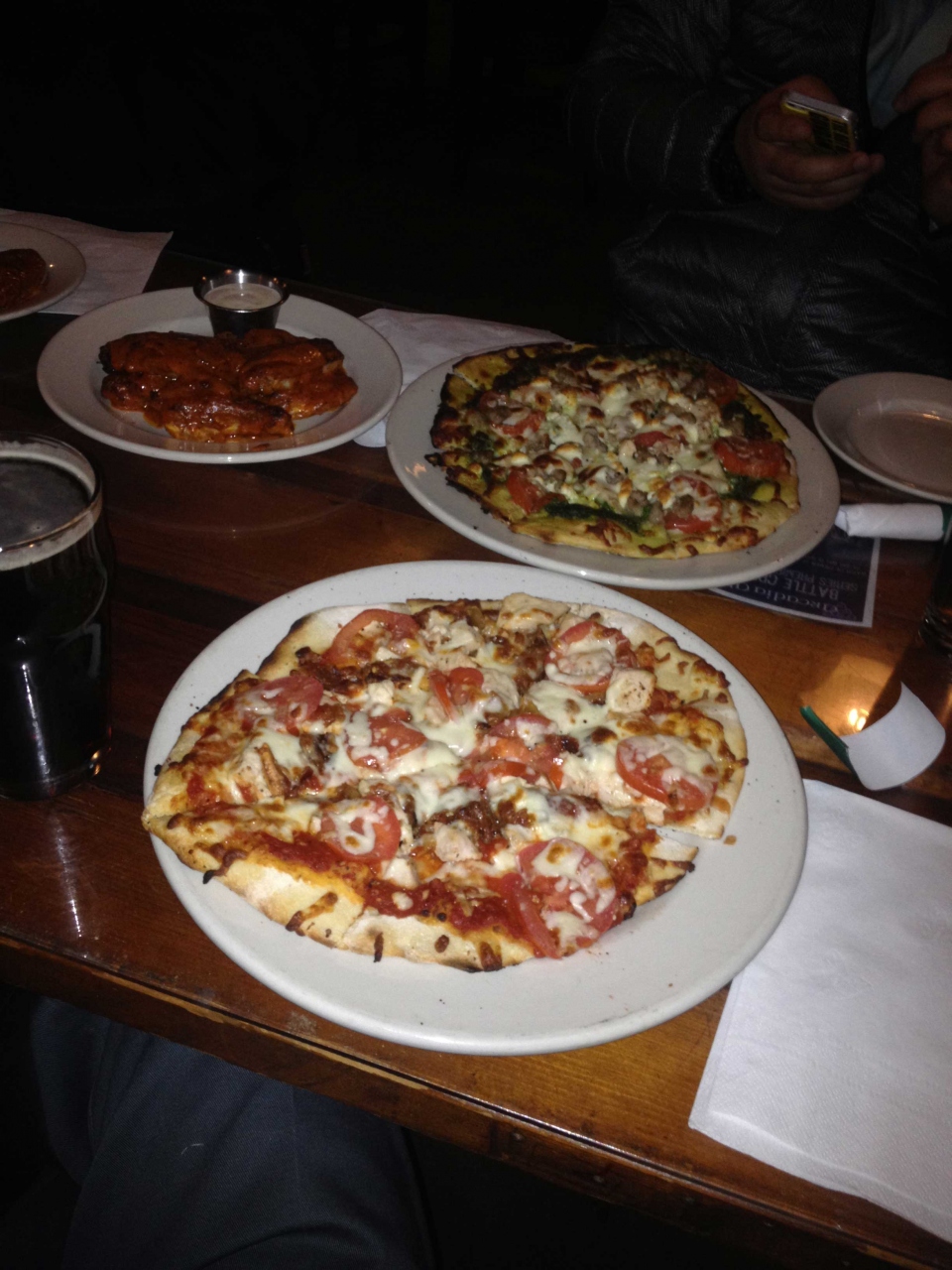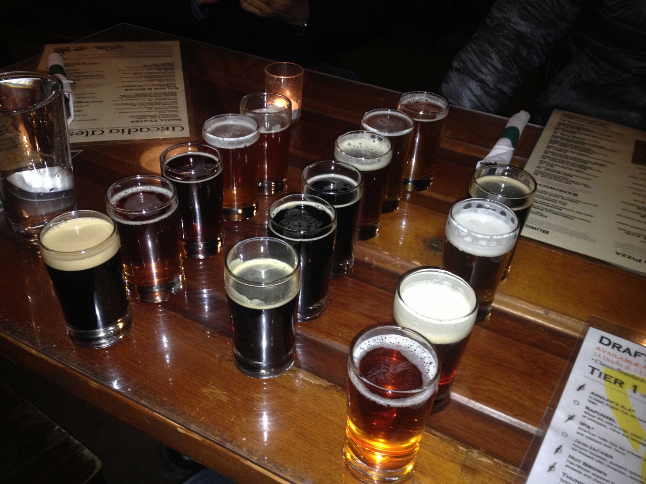 田舎町のビール工房。ピザをつまみにビールをサンプラーで。