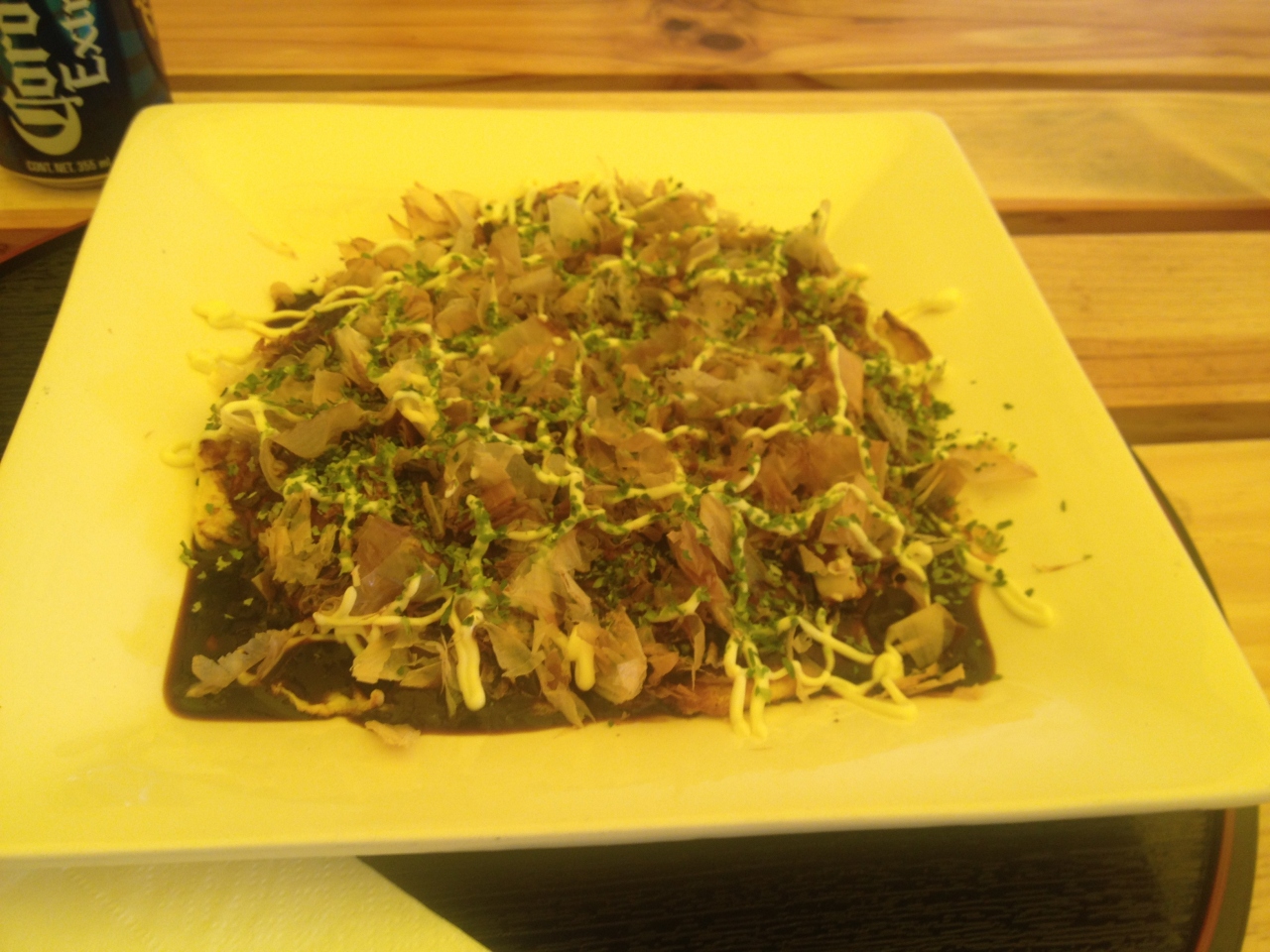 お好み焼きと焼きそばの具が同じなのが面白い。イカや海老がごろごろ入っている。丼ものについては賛否両論ありますね。