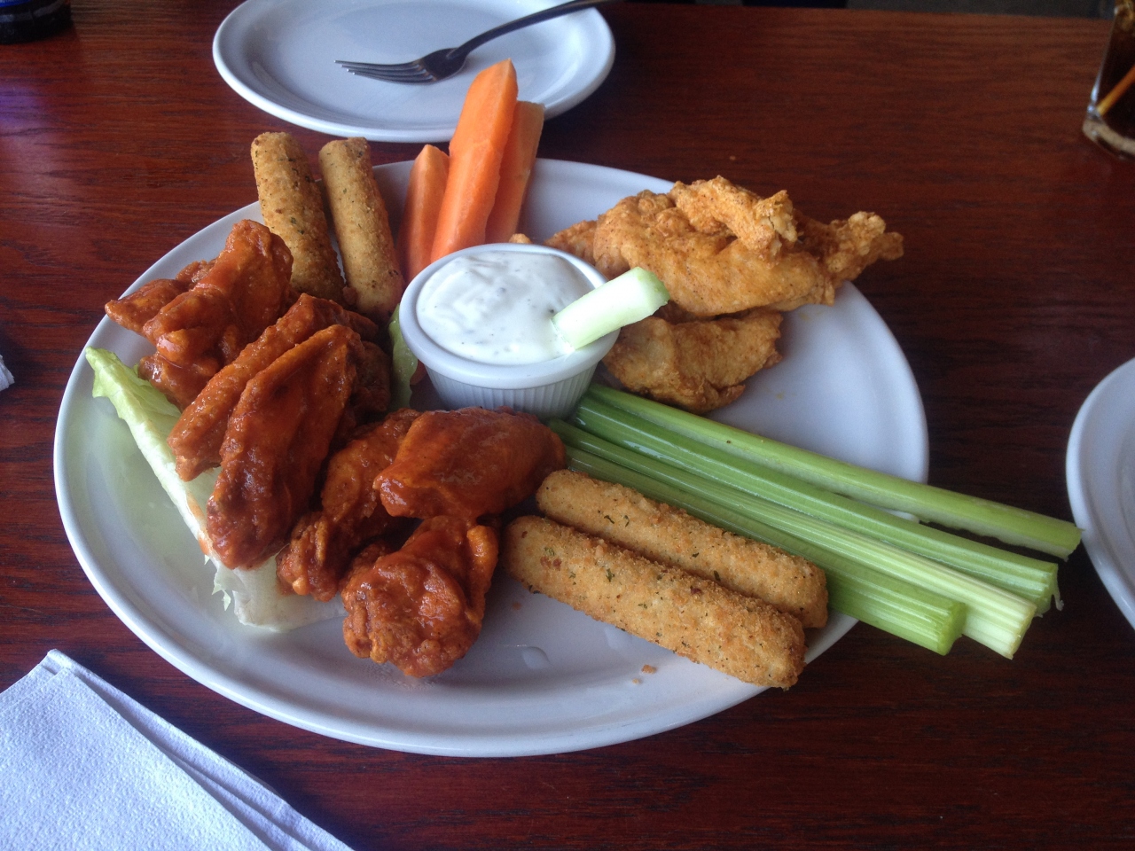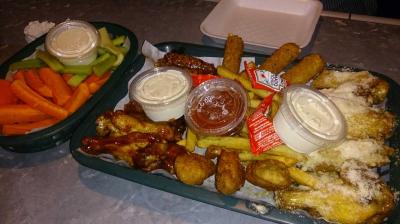 バスケットで手羽3種類とフレンチポテト、チーズフライが乗っていて2人でがっつり。人参とセロリのスティックが付いています。