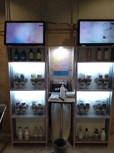 システムがちょっと変わっていて、バスローブや空気清浄機等が部屋の外にあって、必要な人が持ち込む。シャンプーのバーがあって色々選べる。アメニティーがフロントのところにあって自分で持ち込むようになっていました。