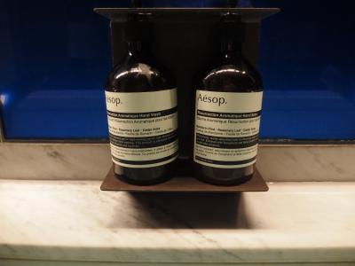 バスルームは非常にモダン。最近のおしゃれホテルのシャワーブースにはなぜドアが付かないのかが不明ですが、こちらももれなくドアは付いておりません。よってシャワーの浴び方によっちゃバスマットがスブ濡れになりますので、ご注意を。