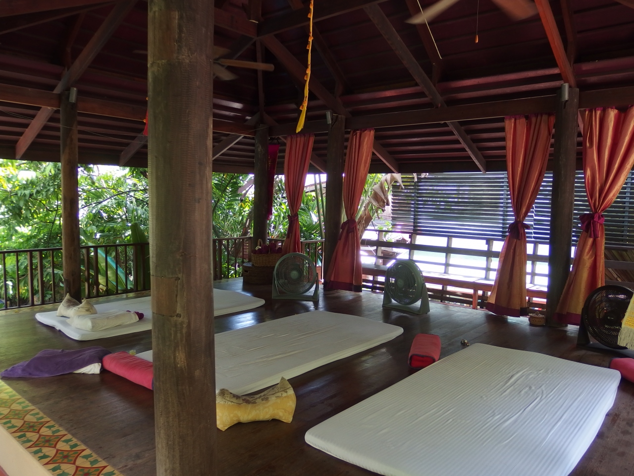 っとマッサージは厳しい修行のようでしたが、雰囲気は良かったです。スパの棟は2階建てで1階がおそらくハーバルコンプレスとかオイルマッサージとかの個室になっていて、2階がオープンスペースのマッサージ処となっております。開放感にあふれていてとってもいい感じです。屋根は付いておりますがオープンスペースですのでクーラー無しです(扇風機のみ)。9月の午前中でしたので、まだ耐えられるくらいの暑さでしたが、真夏はどうなんだろう?あと、バンコク市内の所々に漂う生ごみ臭というか、下水臭というか、ちょっと不快なカオリが扇風機に乗ってやってきます。ずっとそのカオリがするわけじゃないので許容範囲といえばそうなりますが、できればリラックスしにきている場所では不快なカオリはかぎたくないですよねぇ…。- 旅行時期