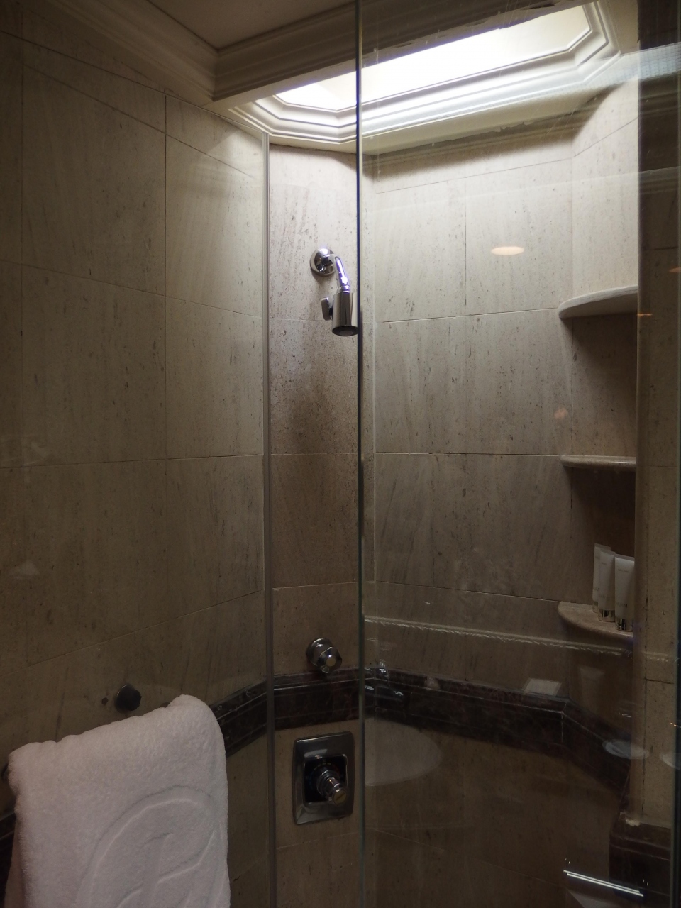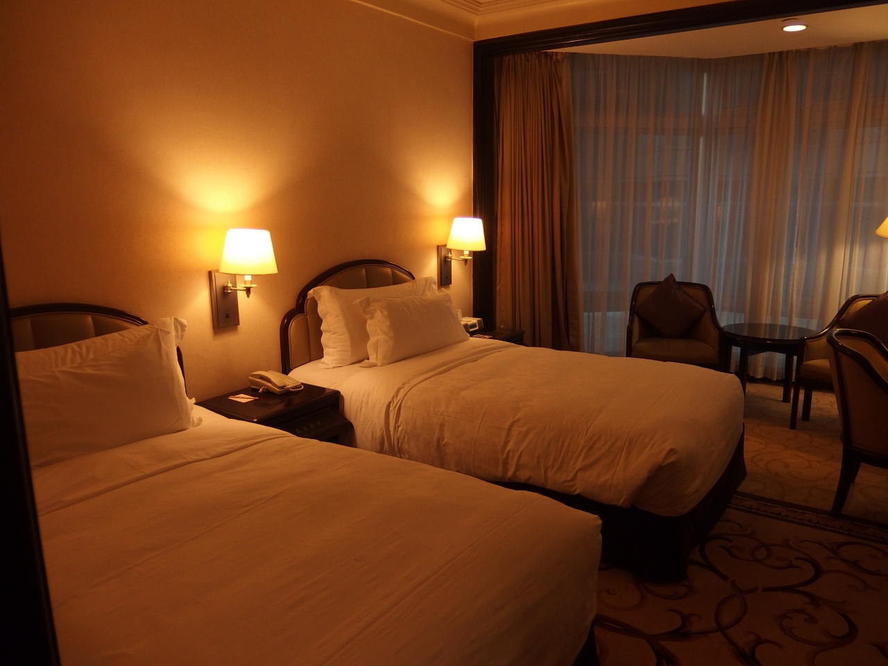 1泊目、3階の部屋をあてがわれました。入ると、タバコ臭いのか、カビ臭いのか、埃臭いのか、とにかく何か臭い。のどが痛くなり、部屋を変えてもらうことにしました。フロントへ行くとダブルは空いているがツインが満室なので変更は無理、明日まで待ってくれと言われました。連れがダブルは嫌だというのでしかたなく元の部屋へ。ハウスキーパーが絨毯になにかスプレーまいてはくれましたが変化なし。(そりゃないわな…)このホテル、景色は売りではないとしてもビル側の部屋だと、日が入らないので暗くてジメっぽい。後から思ったのが、1泊目の部屋は喫煙部屋だったのかも?というのもチェックイン時に嫌というほど「禁煙室ですよね?」っと確認されたのと、次の日に変えてもらった部屋が12階でしたが、エレベーター降りると「Non-Smoking Floor」との文字がでかでかと見えました。3階にはなかった文字。12階は3階とちがってエレベーターホール、降りても日差しが入り明るい。部屋も通り側だったので光が入って、3階の部屋よりかは数段明るい感じで良かったです。3階も12階も同じことが言えますが、とにかく老舗なもんで設備が古い。全体的な清潔度は申し分ないですが、古いなぁ~っという印象はぬぐえません。バスルームも蛇口がいがんでたりと古さが際立つ。改装もしつつあるようですが、改装済部屋はお値段高い。夜、ベッドメイクしなおしにハウスキーパーさんが来てくれます。たまたまその時に部屋にいたんですが、私のスーツケースを足でけって移動させてました。対応は丁寧なんですけど…。