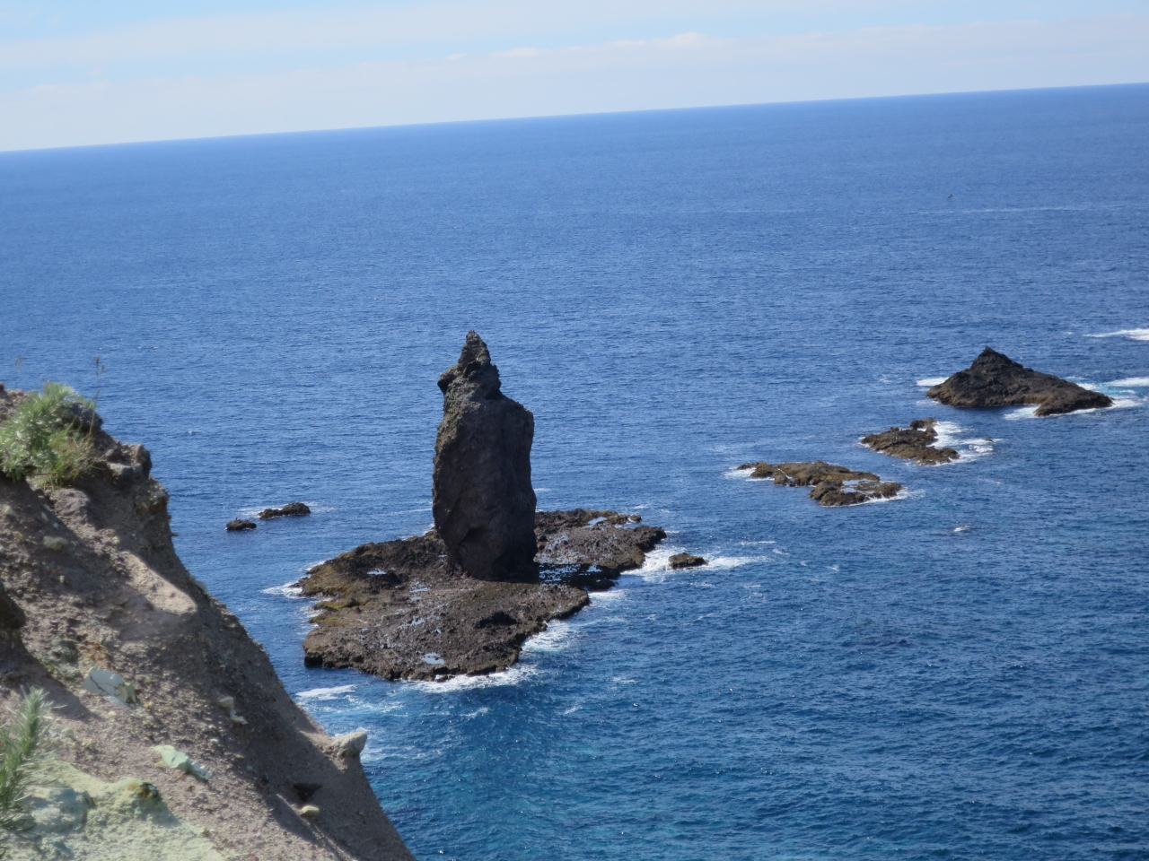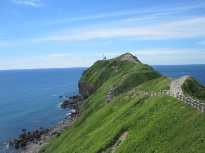 神威岬の駐車場、遊歩道の入口に立つお土産屋さんと食堂です。しゃこたんブルーソフトがあり、ほとんどの人が食べていました。食堂では積丹名物の生うに丼が食べられます。お土産は神威岬、積丹のステッカーや地酒がありました。