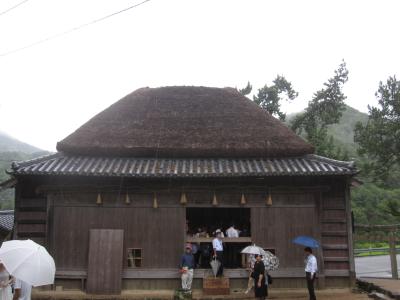 江戸末期の建築で、国定重要無形民俗文化財に指定されています。かやぶき屋根の舞台小屋は肥土山離宮八幡神社の境内にあります。普段は公開されていないのですが、たまたま公開されていました。回り舞台の仕掛け等を見ることができました。