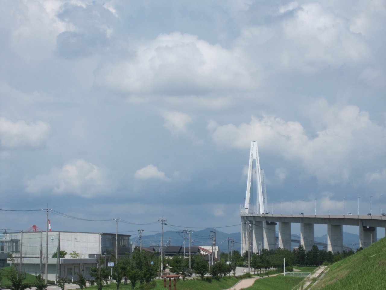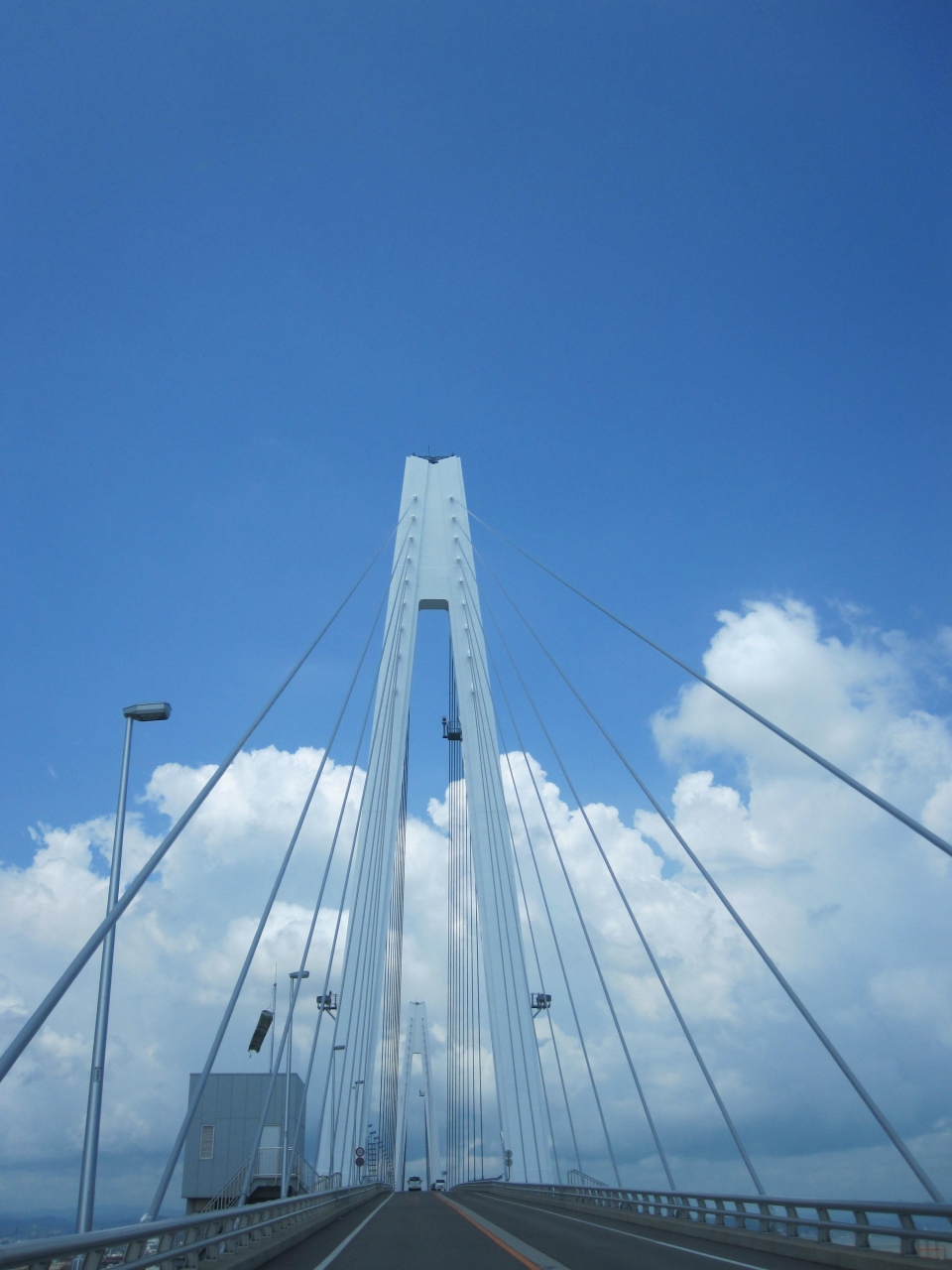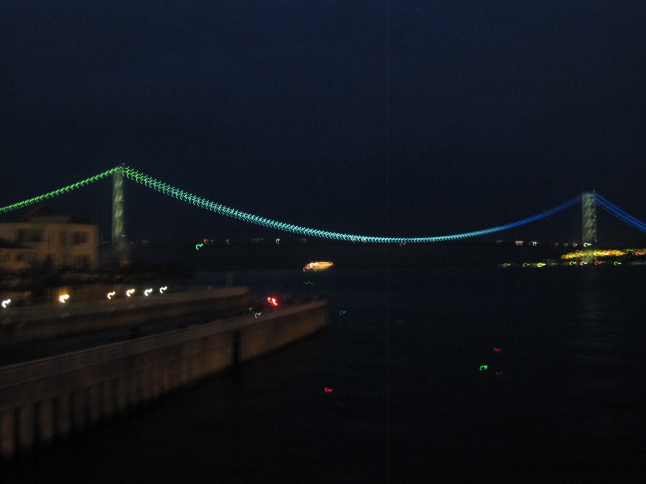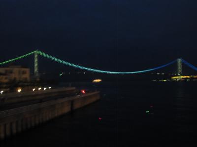 大蔵海岸を少し西に行った所からの明石海峡大橋の眺めです。ライトアップが綺麗に見えます。写真ではわからないのですが、この海域は運行している船が多いので、船のライトもキラキラして綺麗です。ライトアップは時間や時期によっても変わります。