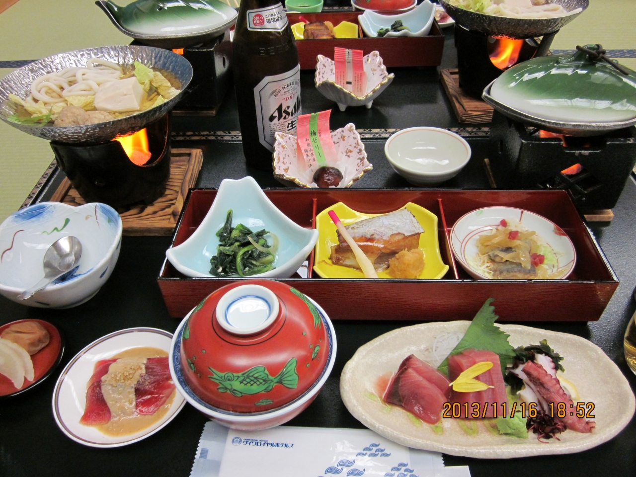カニだけではなく但馬牛も頂けるコースにしました。お部屋食です。大きな火鉢ではカニだけではなく、しいたけや竹輪を焼いて頂きました。但馬牛のハーブ塩包み焼も美味しかったです。カニだけもいいのですが、ちょっと違ったメニューがあるのも良かったです。火鉢で焼いた竹輪はお宿のオリジナルでとても美味しかったです。朝市で販売しているとの事でしたが、私達が行った時には残念ながらありませんでした。