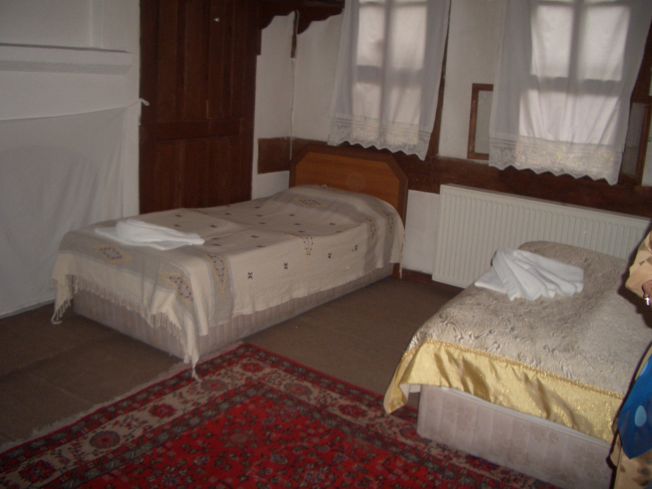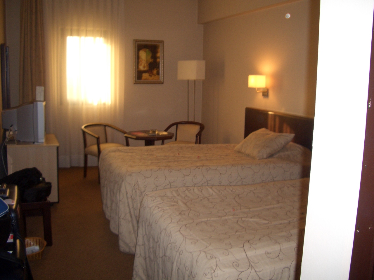 部屋には、テーブルと椅子2脚あるが、トランク2ケを広げるには、少し狭い。